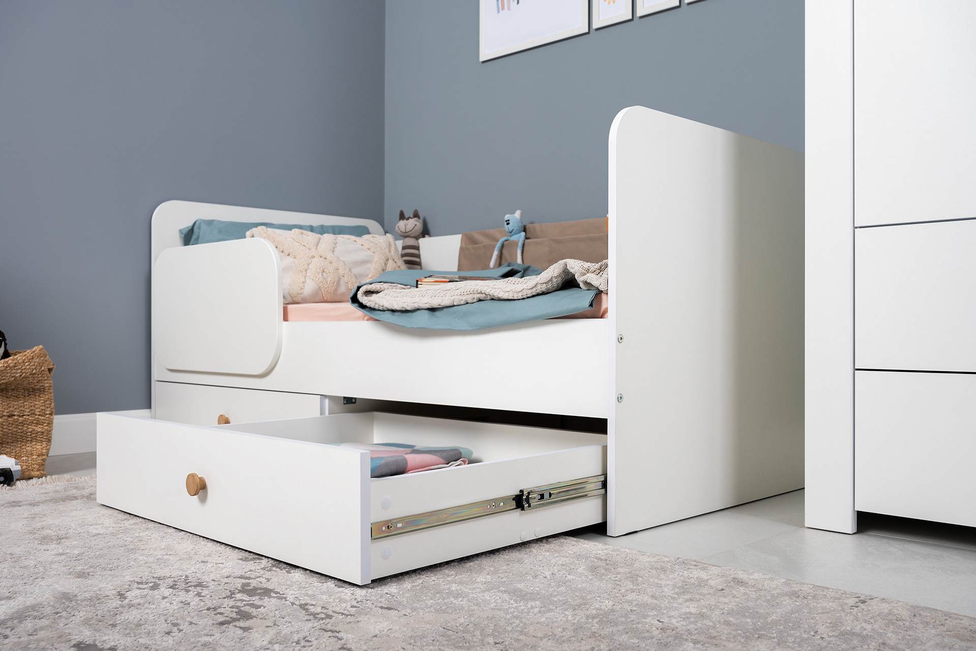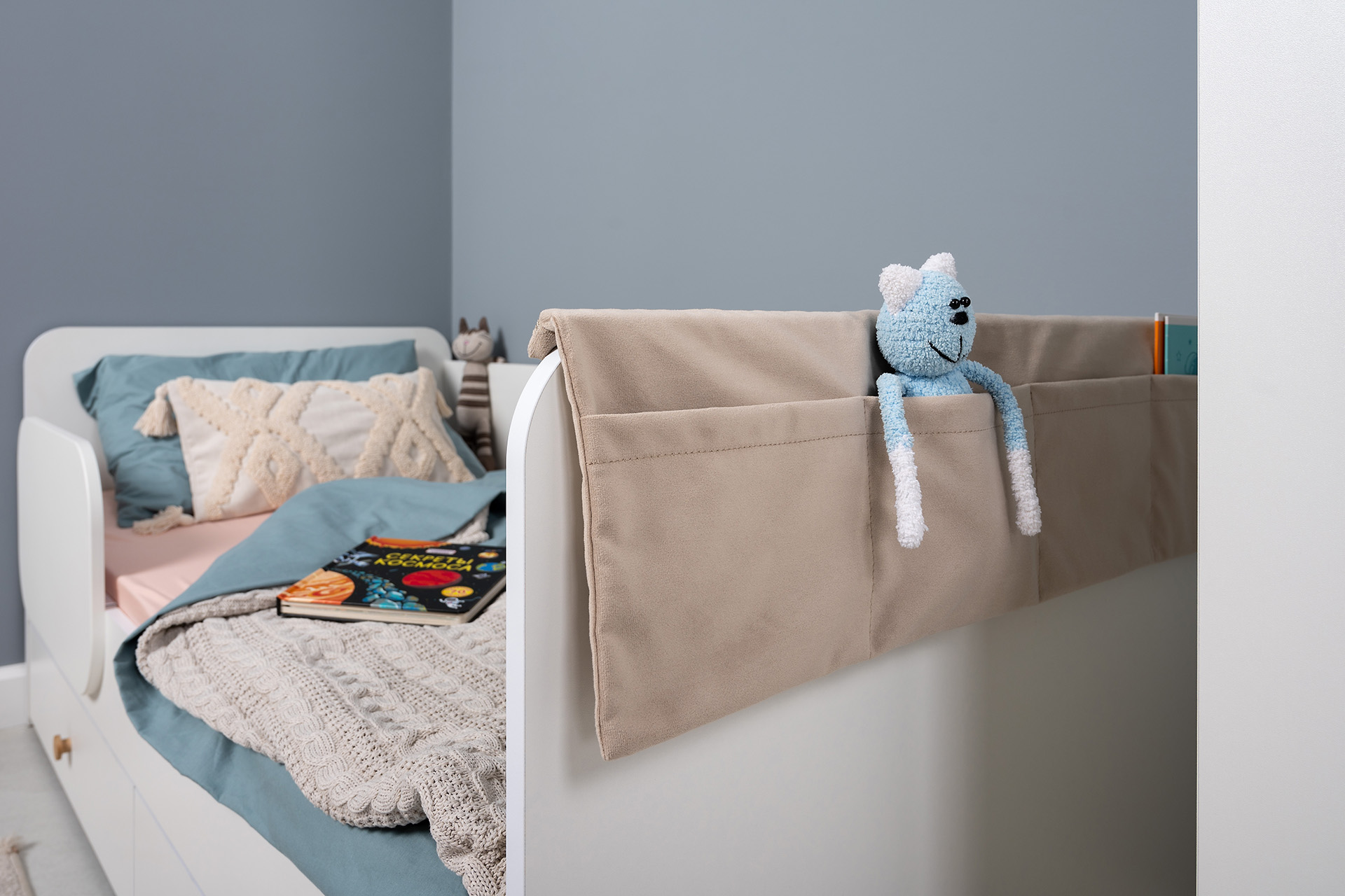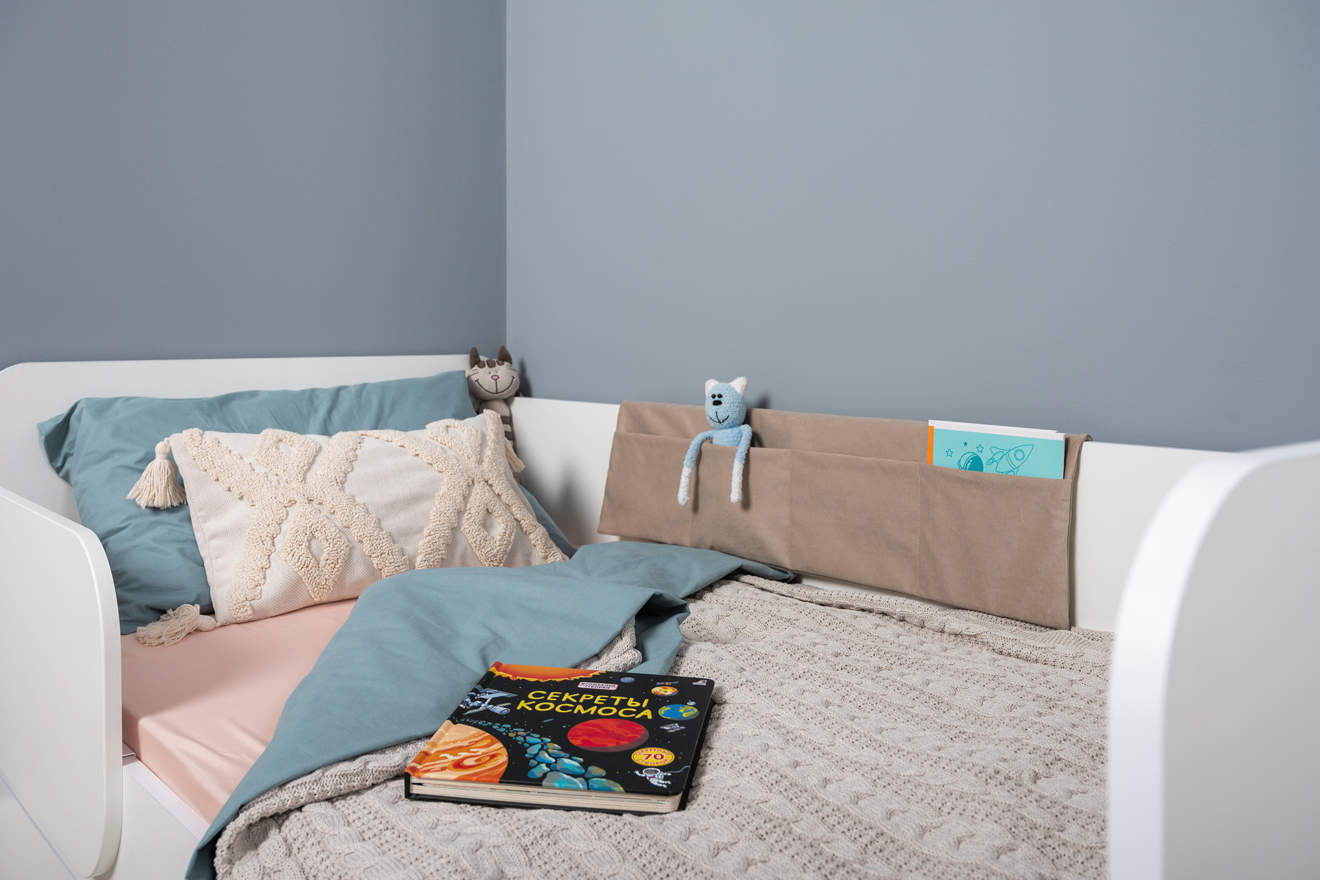 Джастин уникален тем, что подходит для разных возрастных категорий: для малышей – кроватка с защитным бортиком, съемными тканевыми кармашками и выкатными ящиками; для подростков – кровать с полноценным спальным местом и нишей для книг в изголовье; всевозможные модули для хранения. А в ящик письменного стола можно спрятать под замочек свои сокровища и секреты.