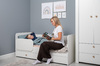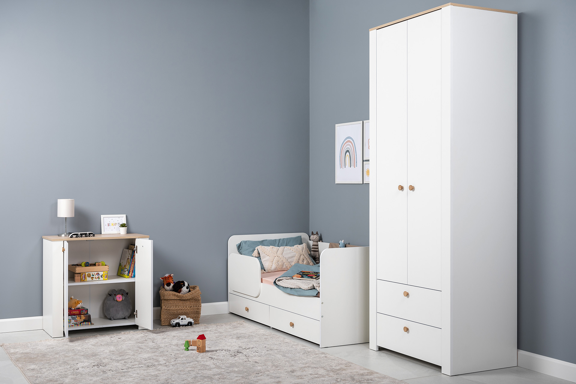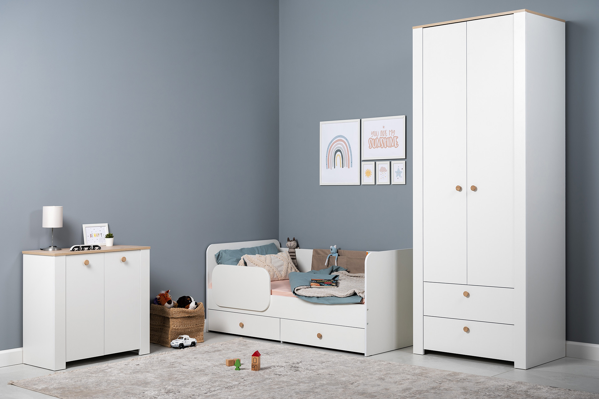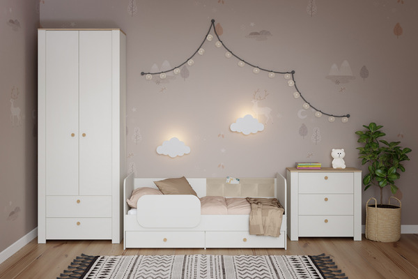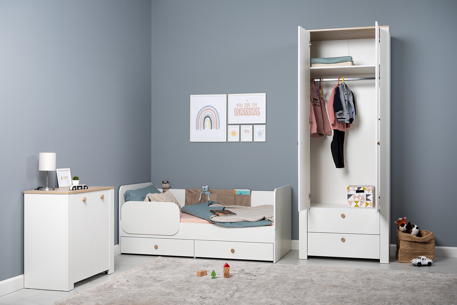 Джастин уникален тем, что подходит для разных возрастных категорий: для малышей – кроватка с защитным бортиком, съемными тканевыми кармашками и выкатными ящиками; для подростков – кровать с полноценным спальным местом и нишей для книг в изголовье; всевозможные модули для хранения. А в ящик письменного стола можно спрятать под замочек свои сокровища и секреты.