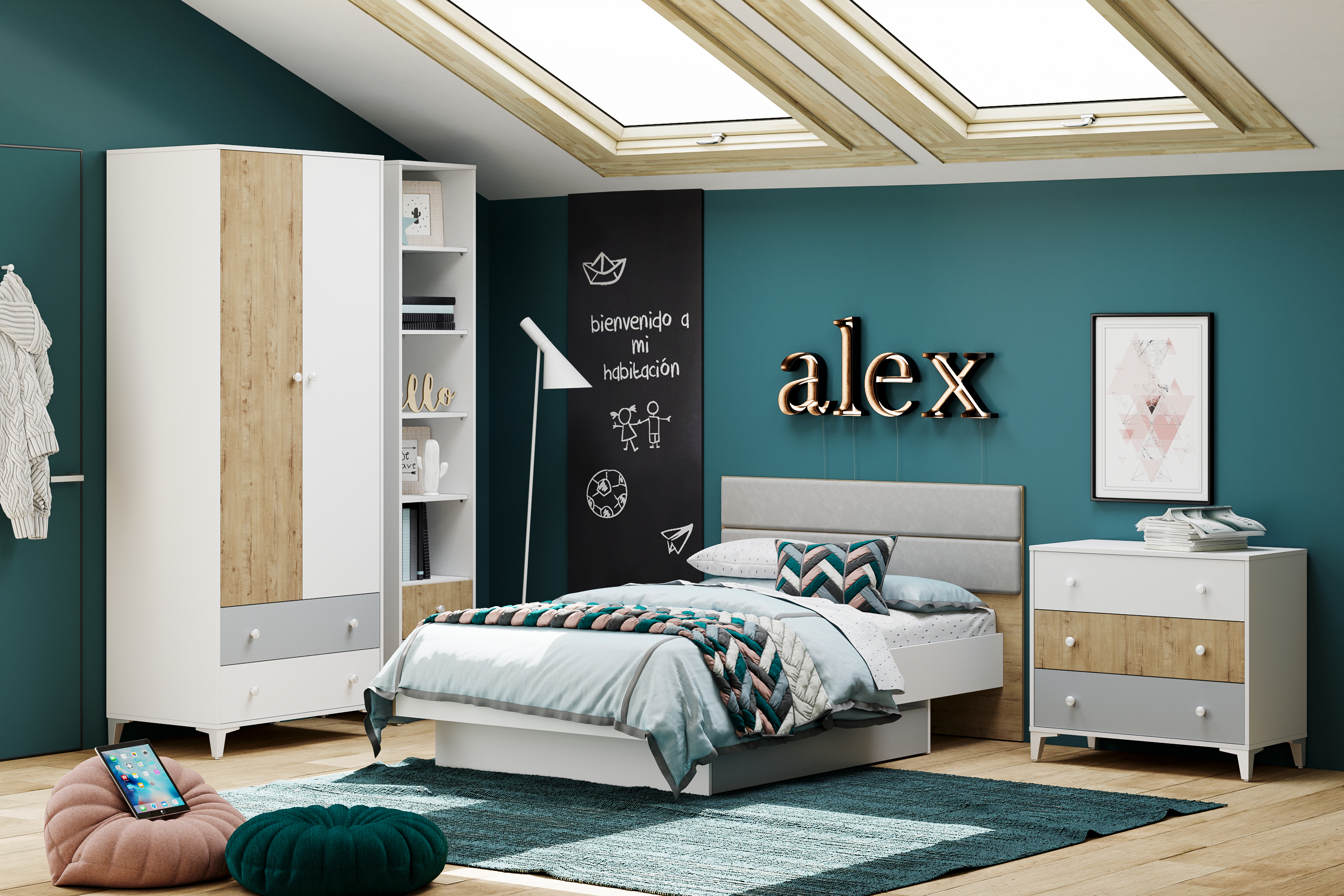 Коллекция «Морти» сочетает в себе актуальный дизайн и высокую функциональность. Практичная композиция с корпусом в древесных тонах и цветными фасадами станет отличным вариантом для меблировки современной молодежной комнаты. В данном комплекте: кровать с бельевым ящиком и мягким изголовьем, тумба с тремя выдвижными ящиками, шкаф-пенал с двумя ящиками и открытыми полками и вместительный распашной шкаф для одежды.