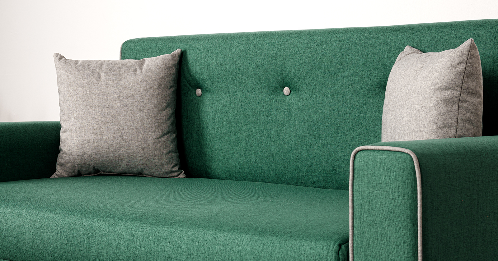Декоративный контрастный кант по торцу спинки, торцу подлокотника, по верхнему срезу царги. Утяжки с пуговицами на спинке дивана. Две декоративные подушки в контрастной ткани.