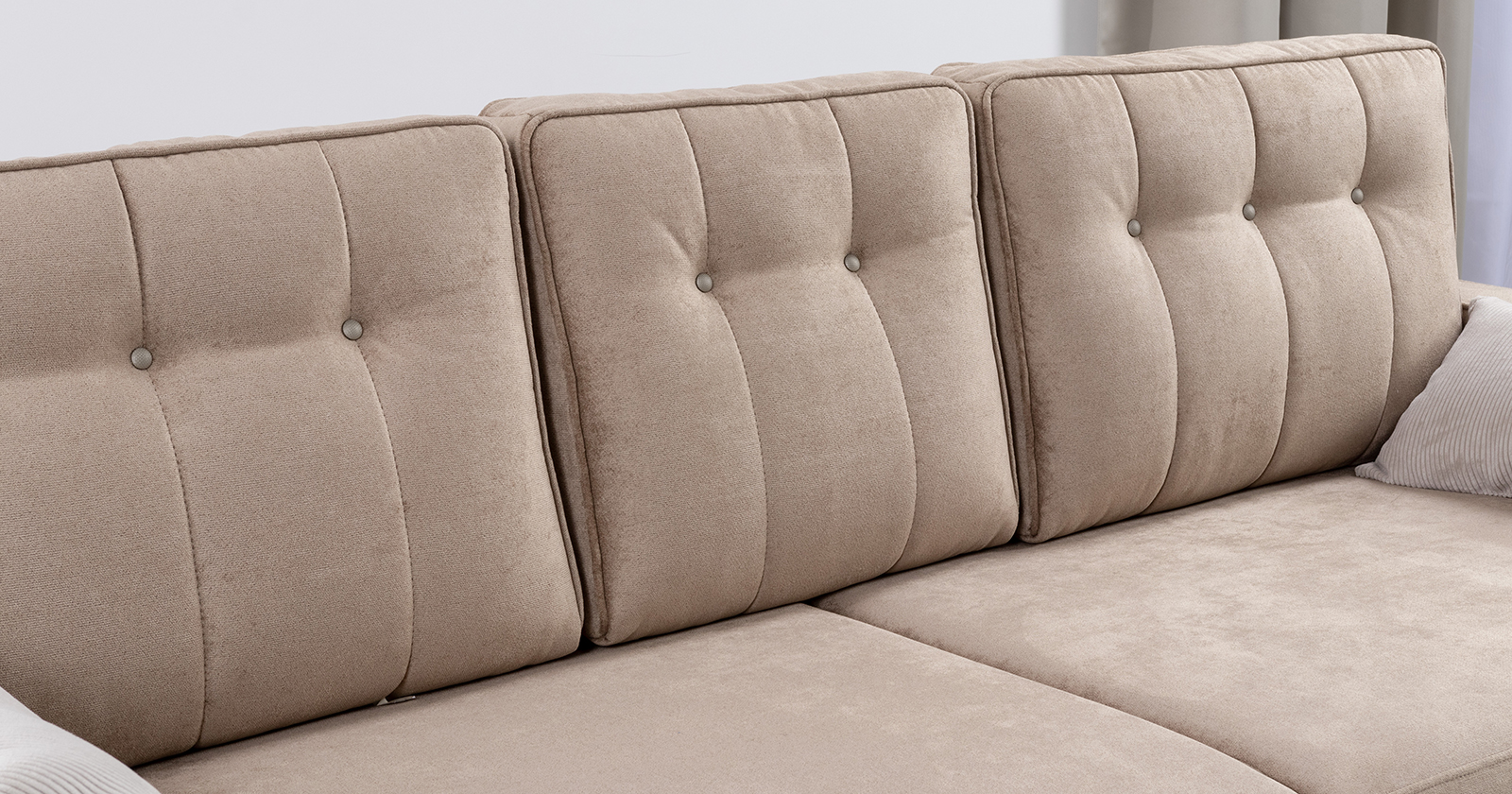 Подушки имеют трапециевидную форму, с утолщением к низу для комфорта посадки. Кант по всему периметру подушек, декоративные утяжки металлическими пуговицами, вертикальная стежка.