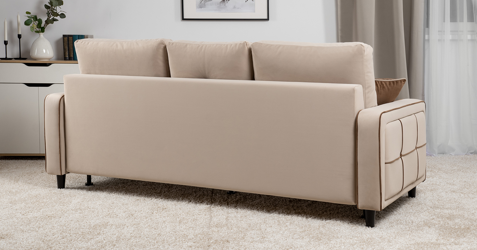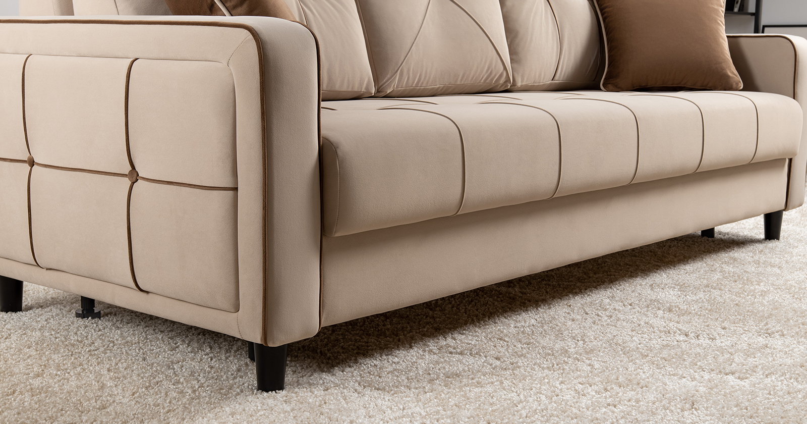 Декоративные канты на подушках и вставке подлокотников. Пуговицы в местах пересечения кантов на подушке и вставке подлокотников. По торцам подлокотников и думках контрастный декоративный кант. Защипы на сиденье и средней большой подушке.