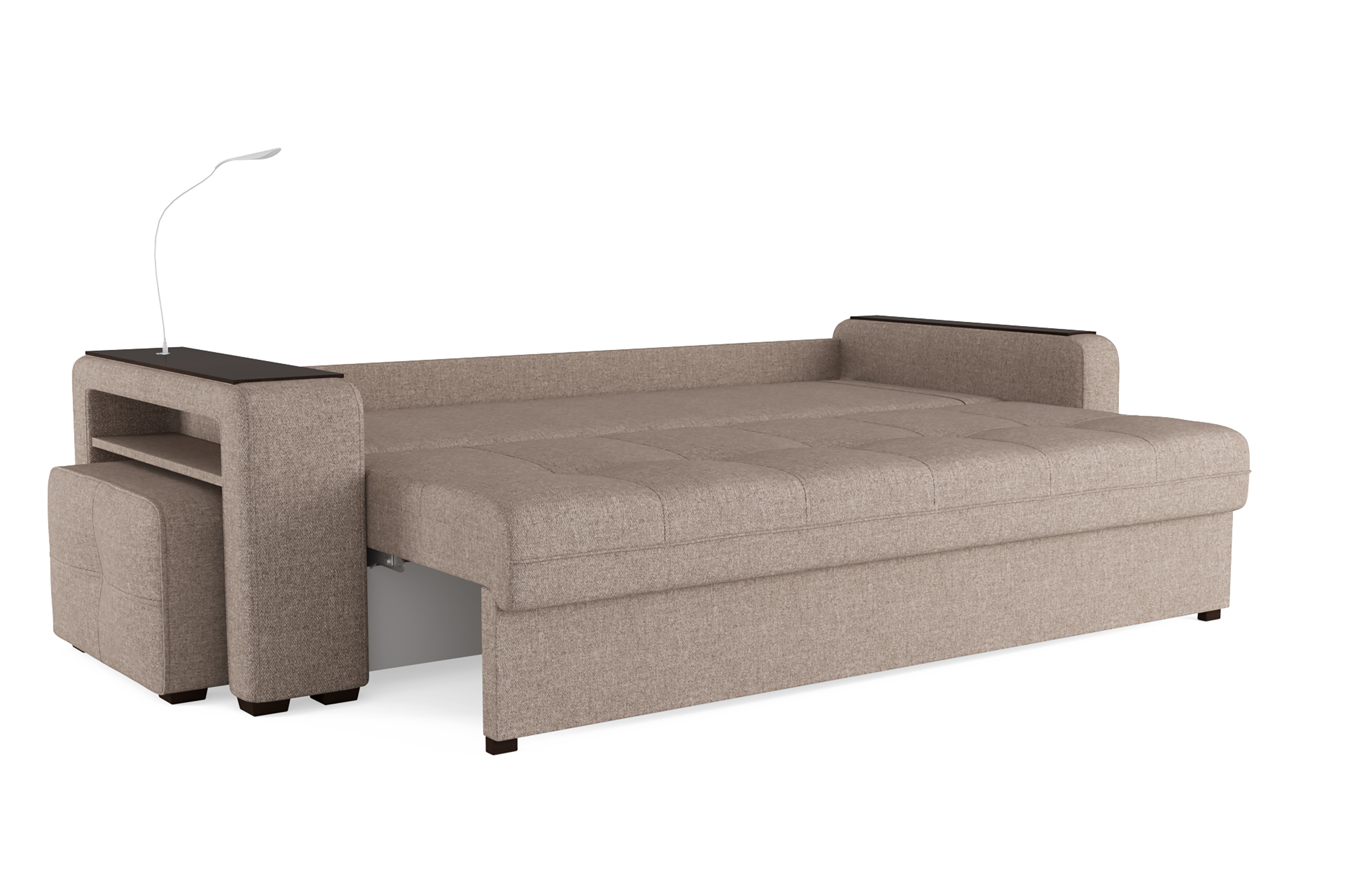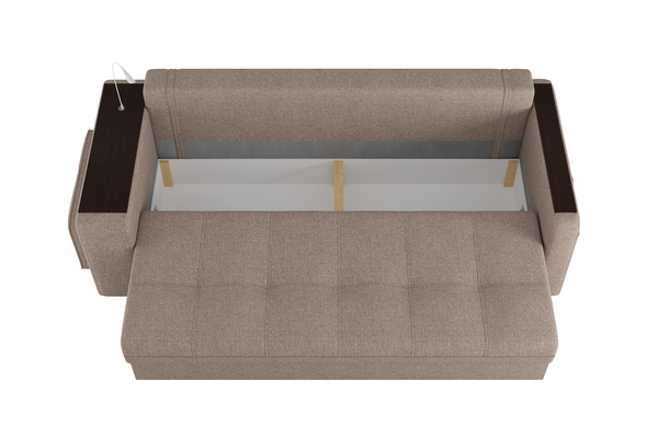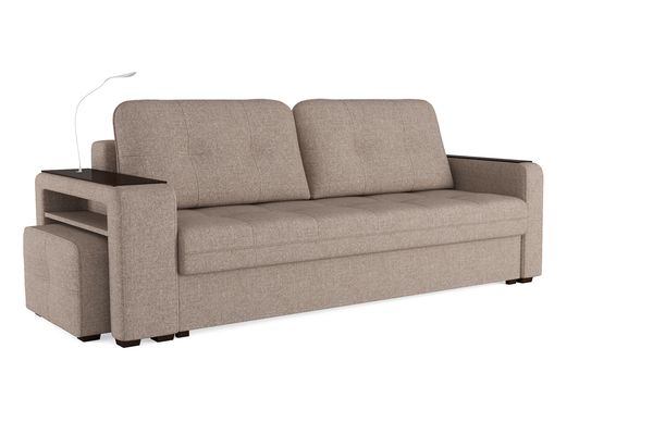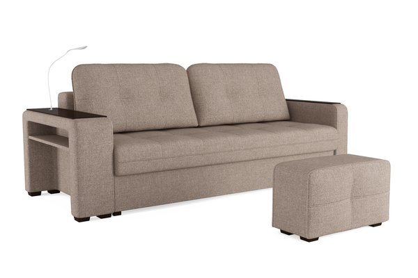 Диван «SMART 4» — это не просто мягкая мебель, а один из ключевых элементов интерьера с обширным функционалом, где эстетика тесно соседствует с комфортом и эргономичностью.  Одна боковина оснащена карманом для хранения мелочей и гаджетов, другая боковина совмещает одновременно: рабочую поверхность, за счет широкой накладки, двойной  usb - порт  и портативную лампу точечного света, которая входит в комплект. Добавить контрастных деталей в интерьер поможет пуф, интегрированный в подлокотник. Этот вариант для современных людей, которые ценят комфорт и удобство отдыха. Мягкое сиденье с легкостью трансформируется в просторное спальное место, на котором смогут утроиться ваши гости. Стильный и уютный, он станет отличным решением, если вы ищите не только красоту, но и комфорт.
