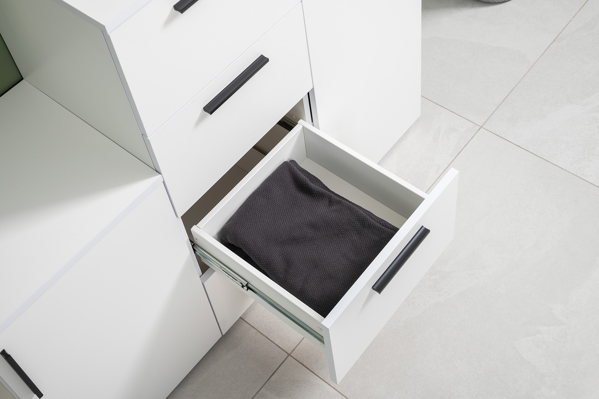 Модули универсальны и сочетаются между собой. Открытые и закрытые ниши для хранения, защитные пластиковые демпферы, съемные полки, направляющие полного выдвижения в ящиках – комфорт продуман до мелочей.