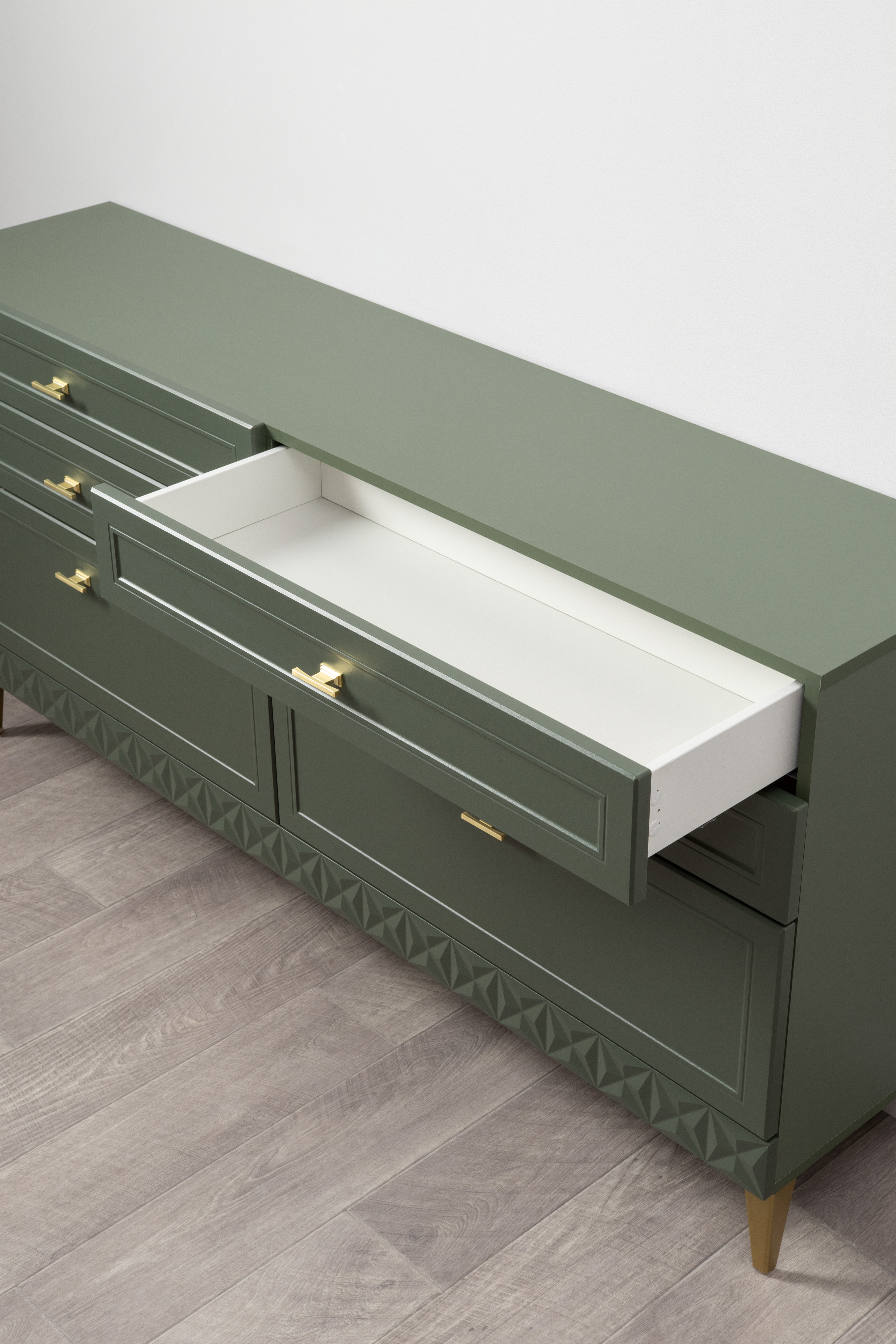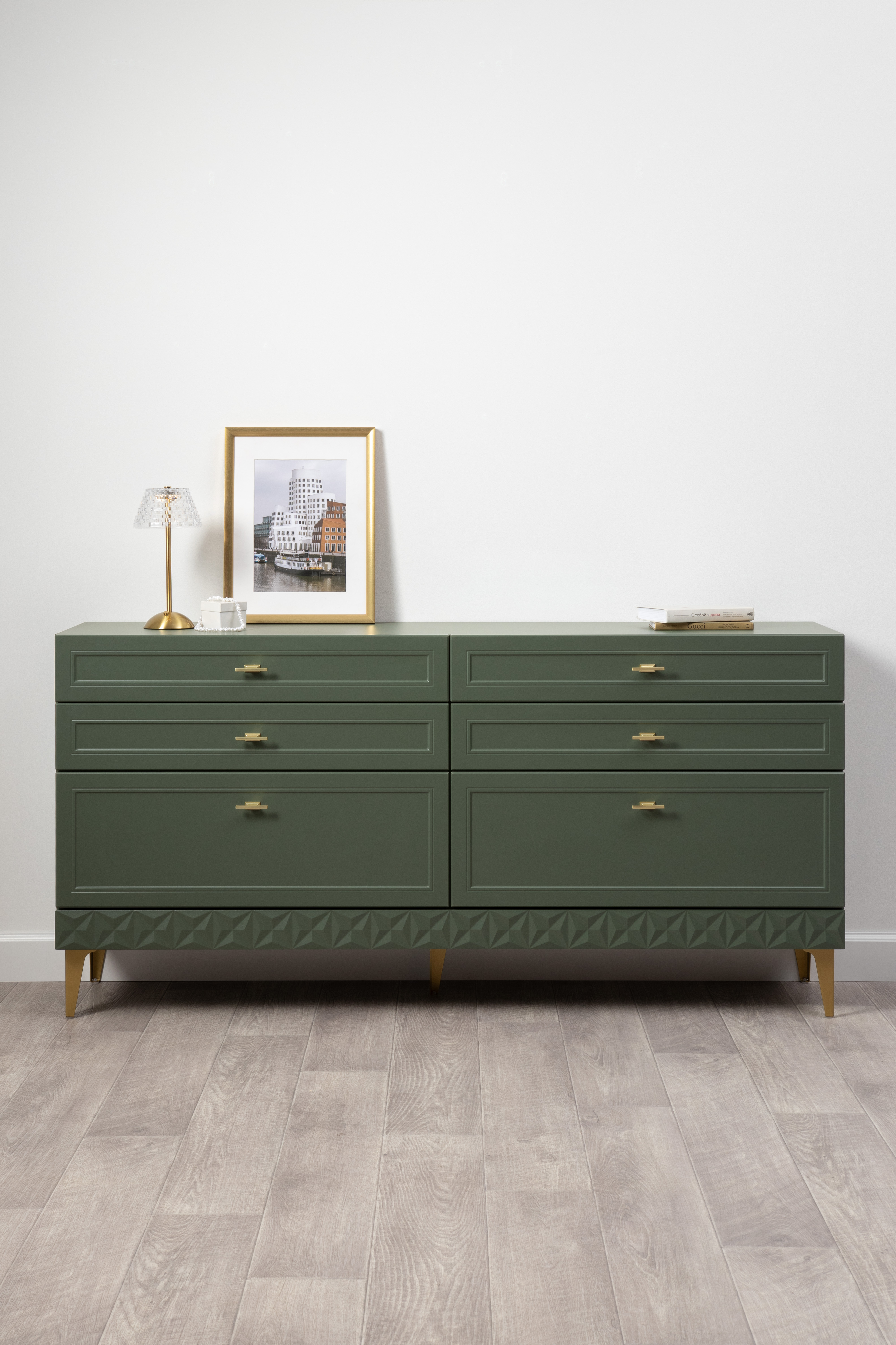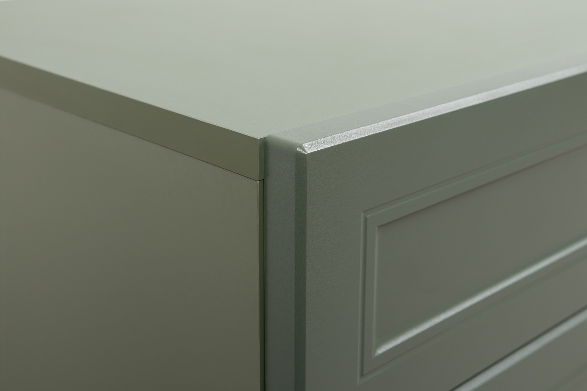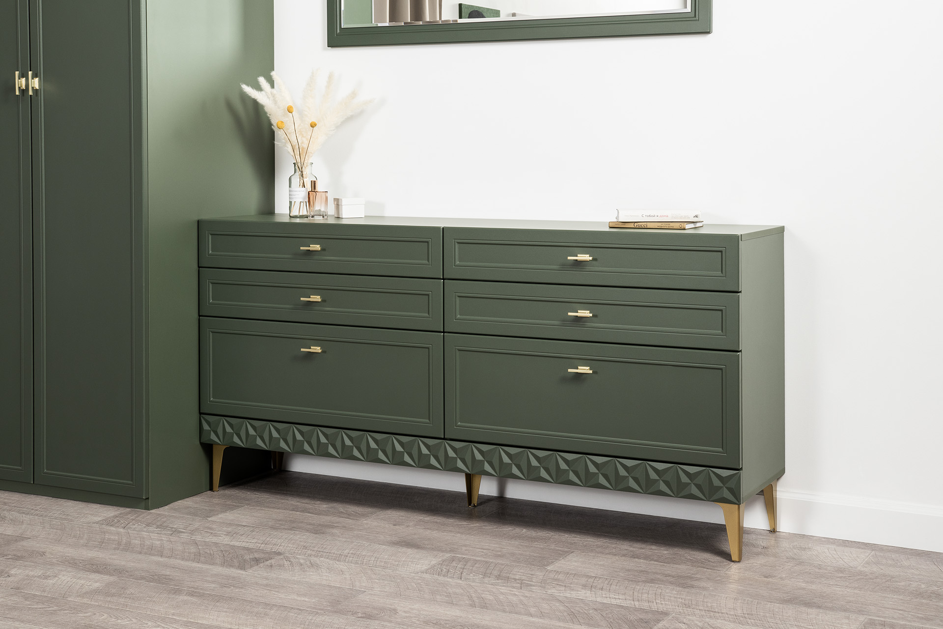 Комод Марион 16.256 дымчатый зеленый K521, олива шагрень AG 1050 ПВХ, белый PE шагрень