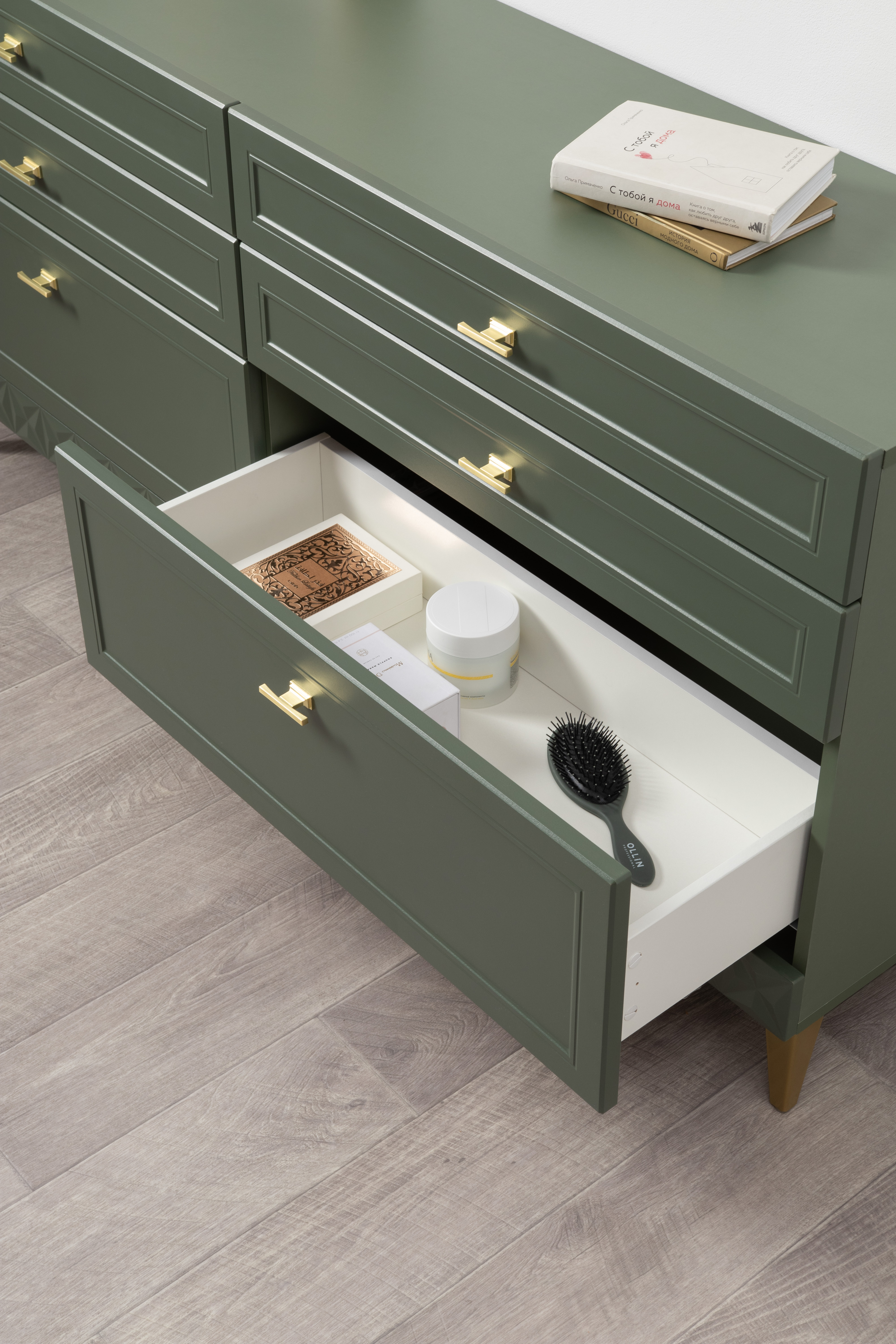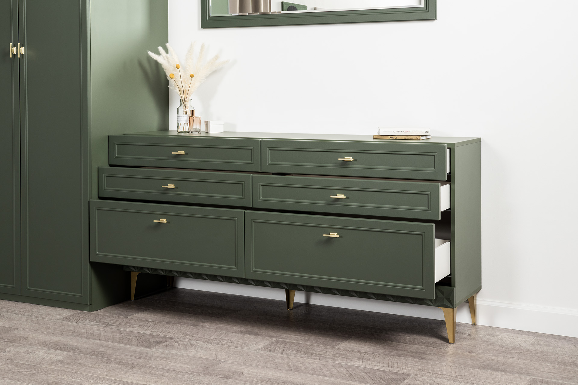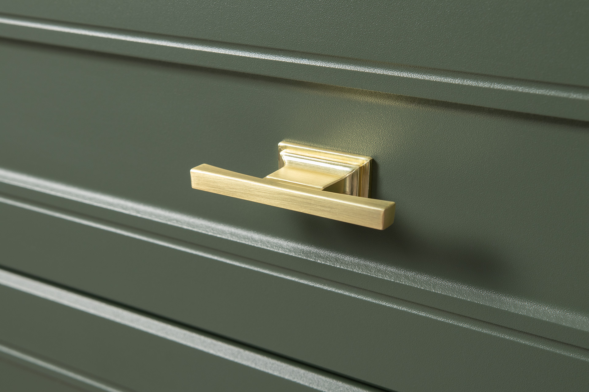 Изящные линии, глубокая фрезеровка фасадов из МДФ и благородные оттенки. Утончённая «Слоновая кость» и изысканная «Олива Шагрень» с глубоким зелёным тоном — создают атмосферу уюта, тепла и благородства. Металлические ручки и опоры золотого цвета придают мебели утончённый блеск, а петли и направляющие с доводчиками обеспечивают плавное и бесшумное закрытие фасадов.