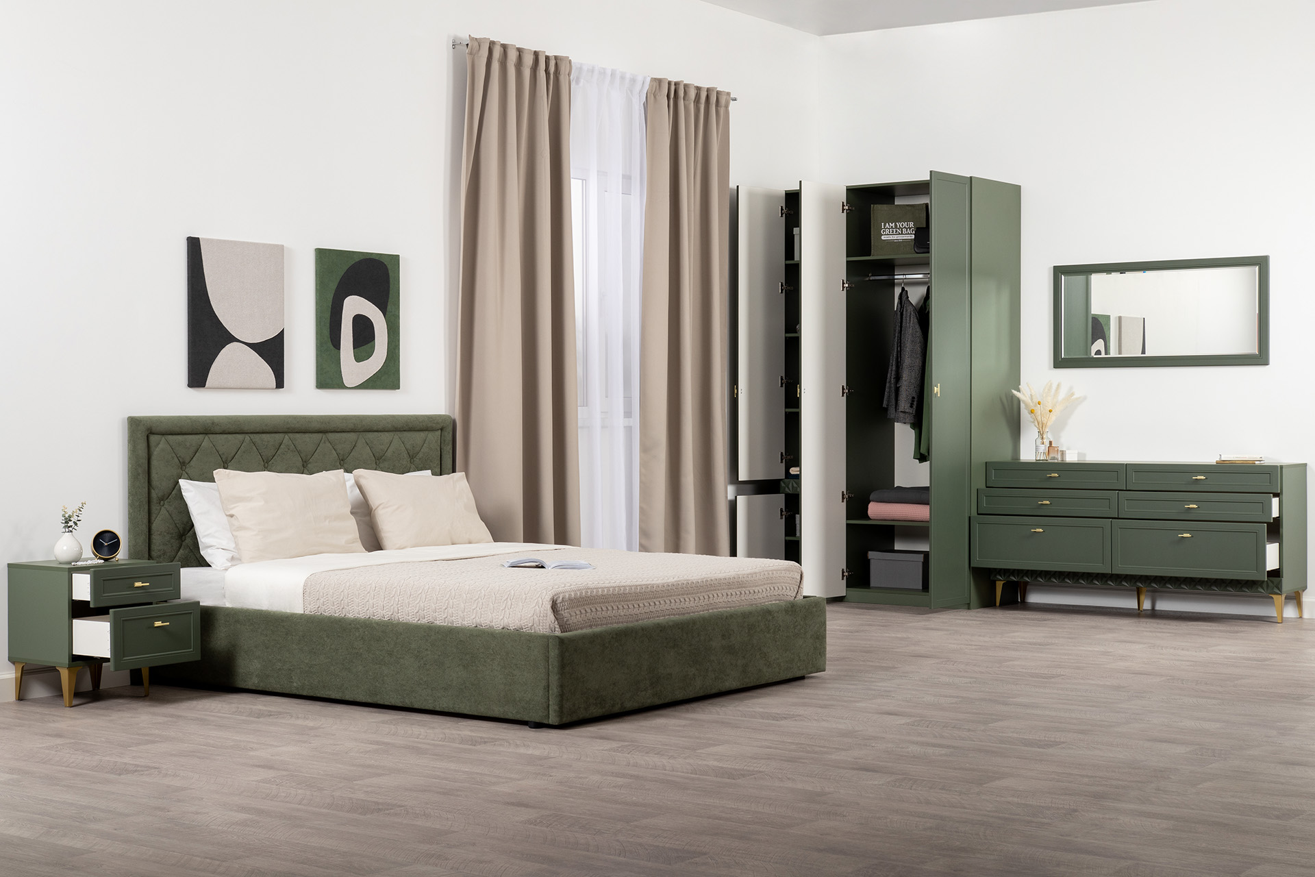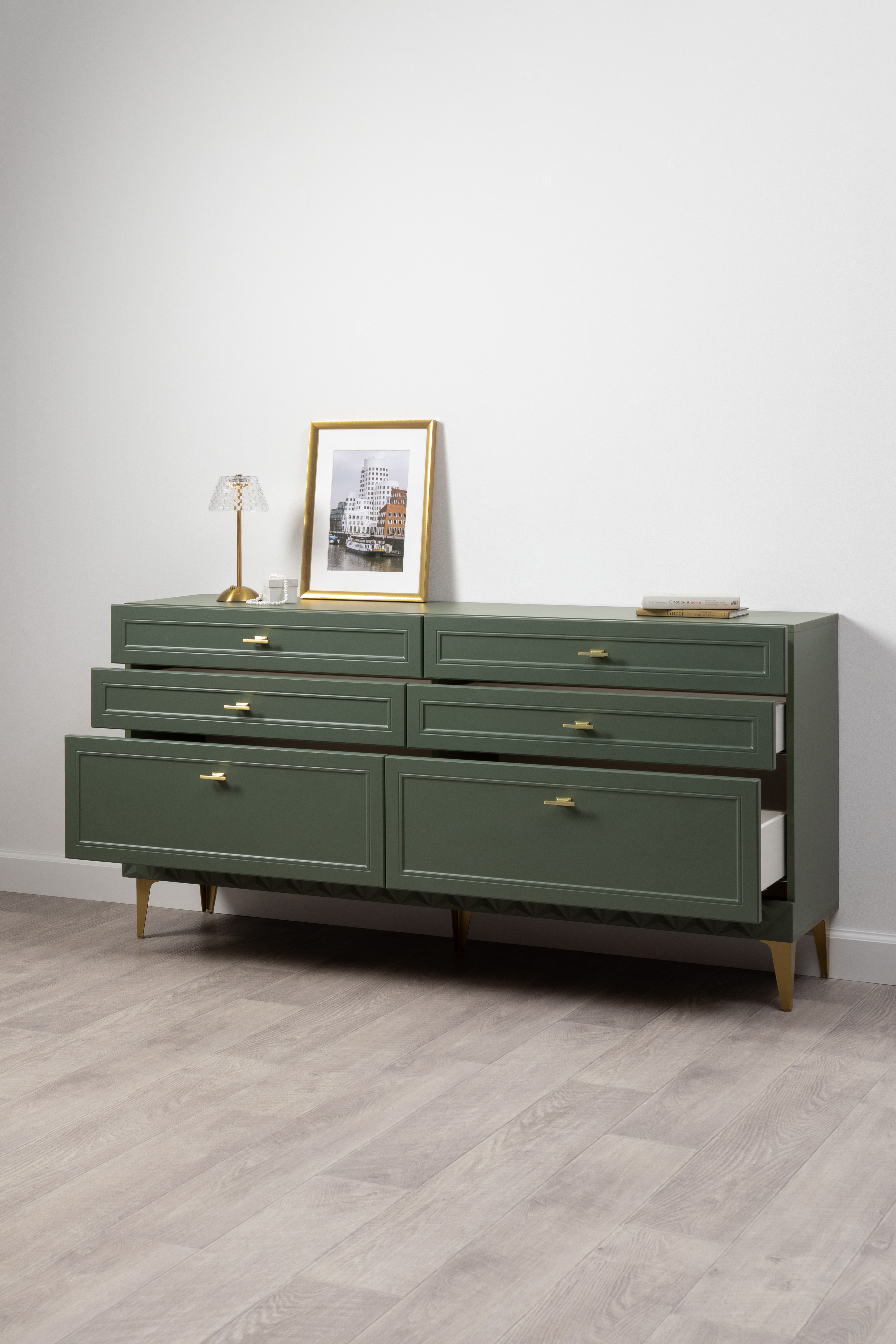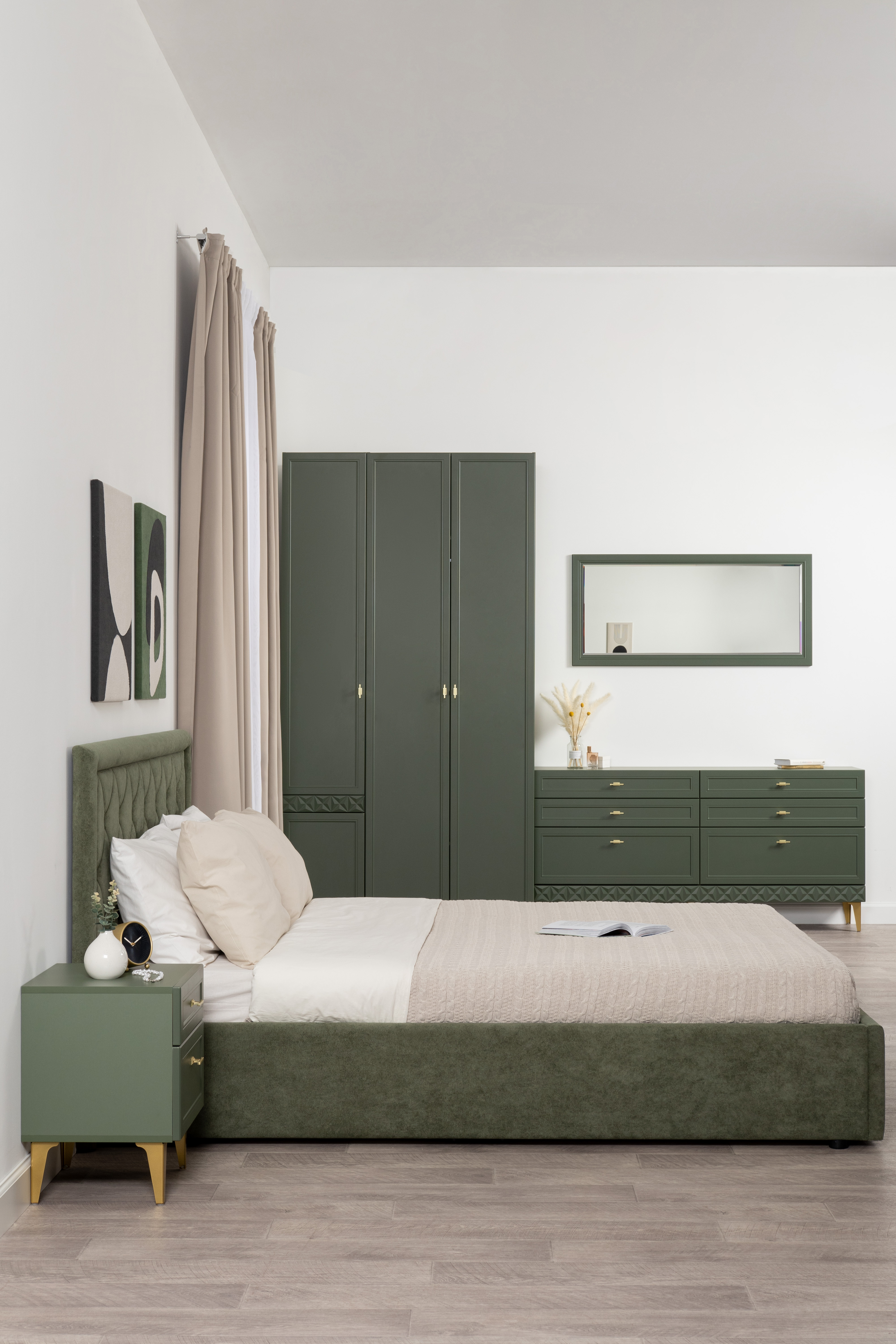 Изящные линии, глубокая фрезеровка фасадов из МДФ и благородные оттенки. Утончённая «Слоновая кость» и изысканная «Олива Шагрень» с глубоким зелёным тоном — создают атмосферу уюта, тепла и благородства. Металлические ручки и опоры золотого цвета придают мебели утончённый блеск, а петли и направляющие с доводчиками обеспечивают плавное и бесшумное закрытие фасадов.