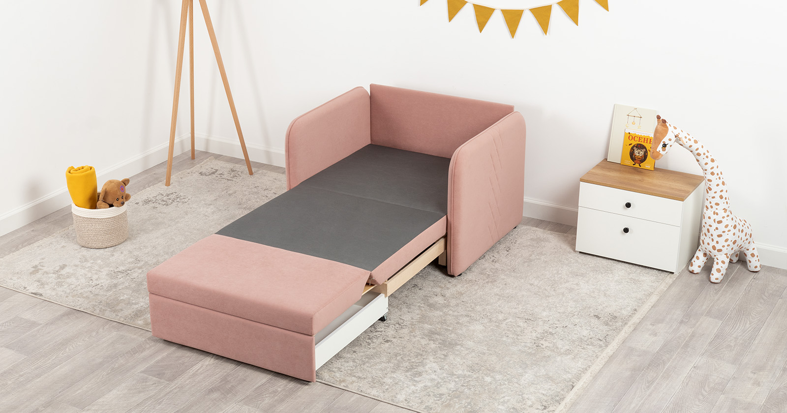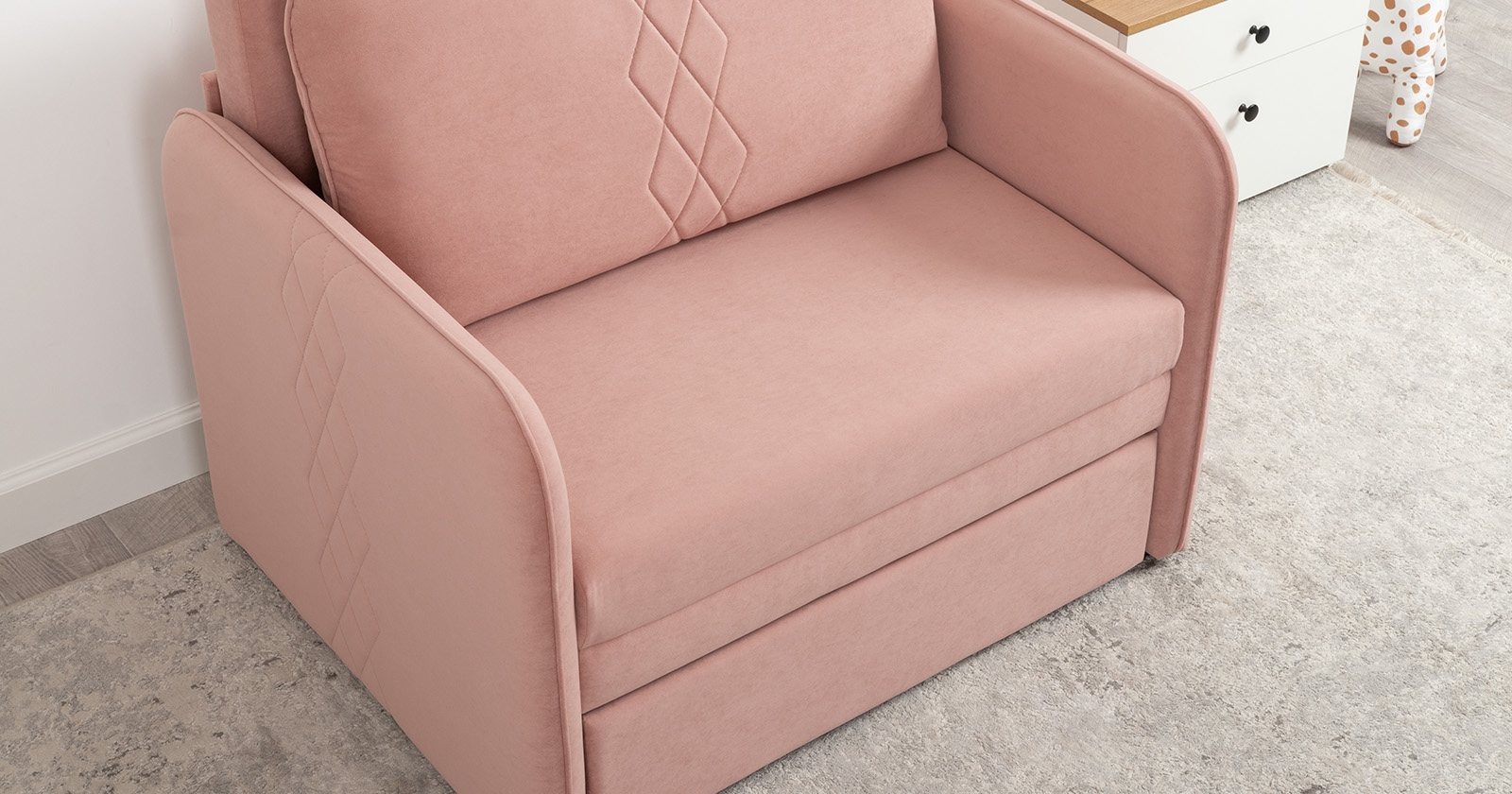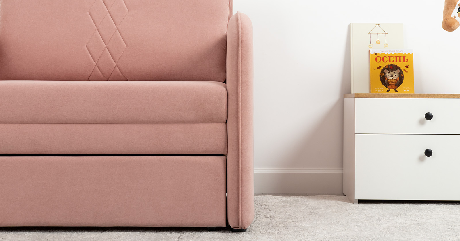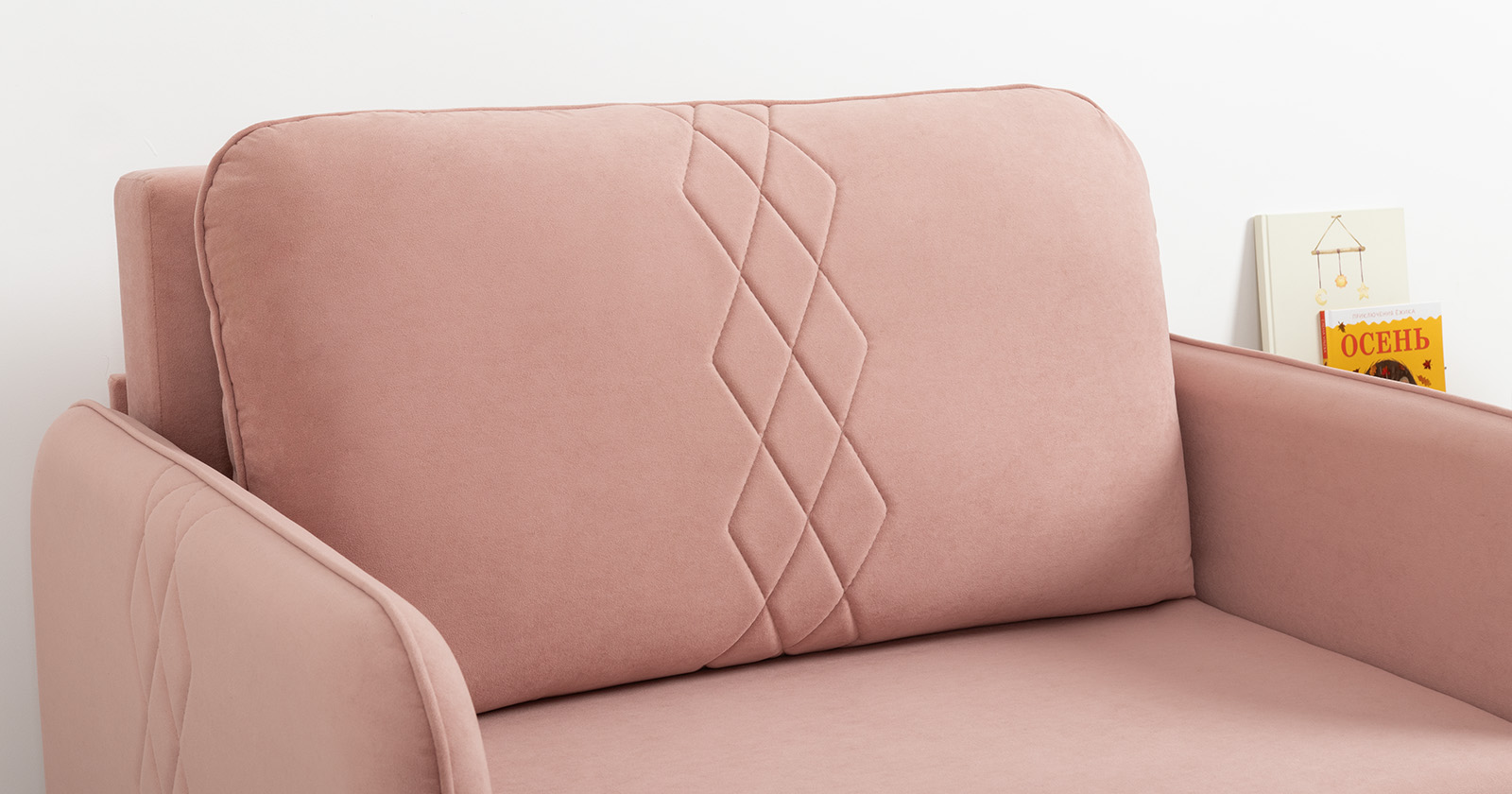 Стильный компактный диван для детской и гостиной. При своих скромных размерах он трансформируется в полноценное спальное место для детей и подростков. Лаконичный дизайн в виде декоративной стежки подчеркивает фактуру велюра, а небольшие размеры позволят разместить его в любом пространстве.