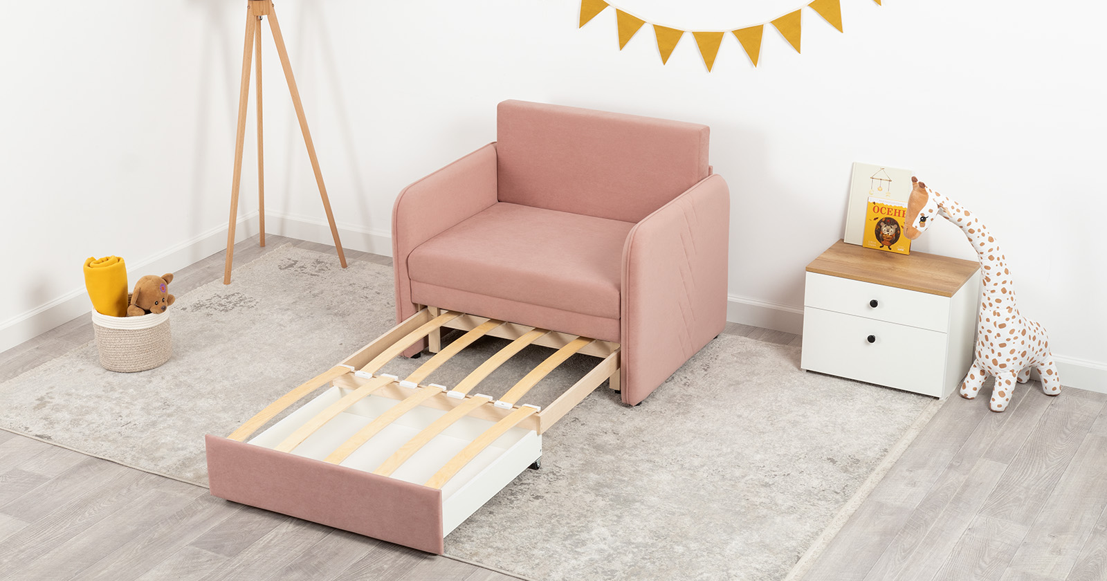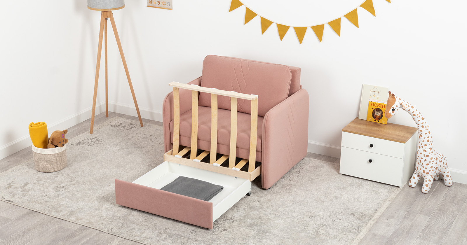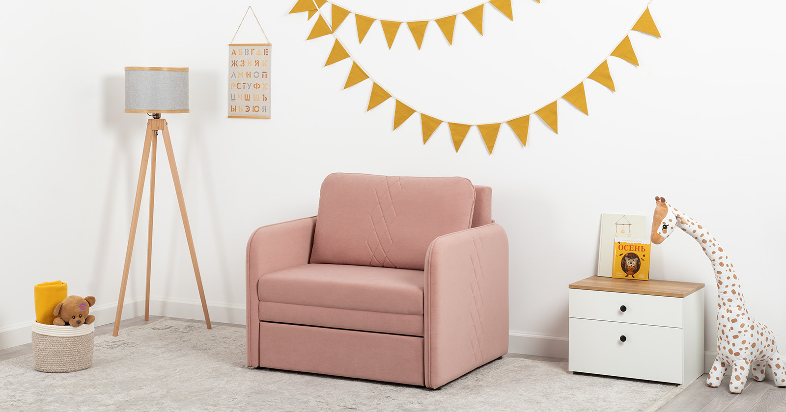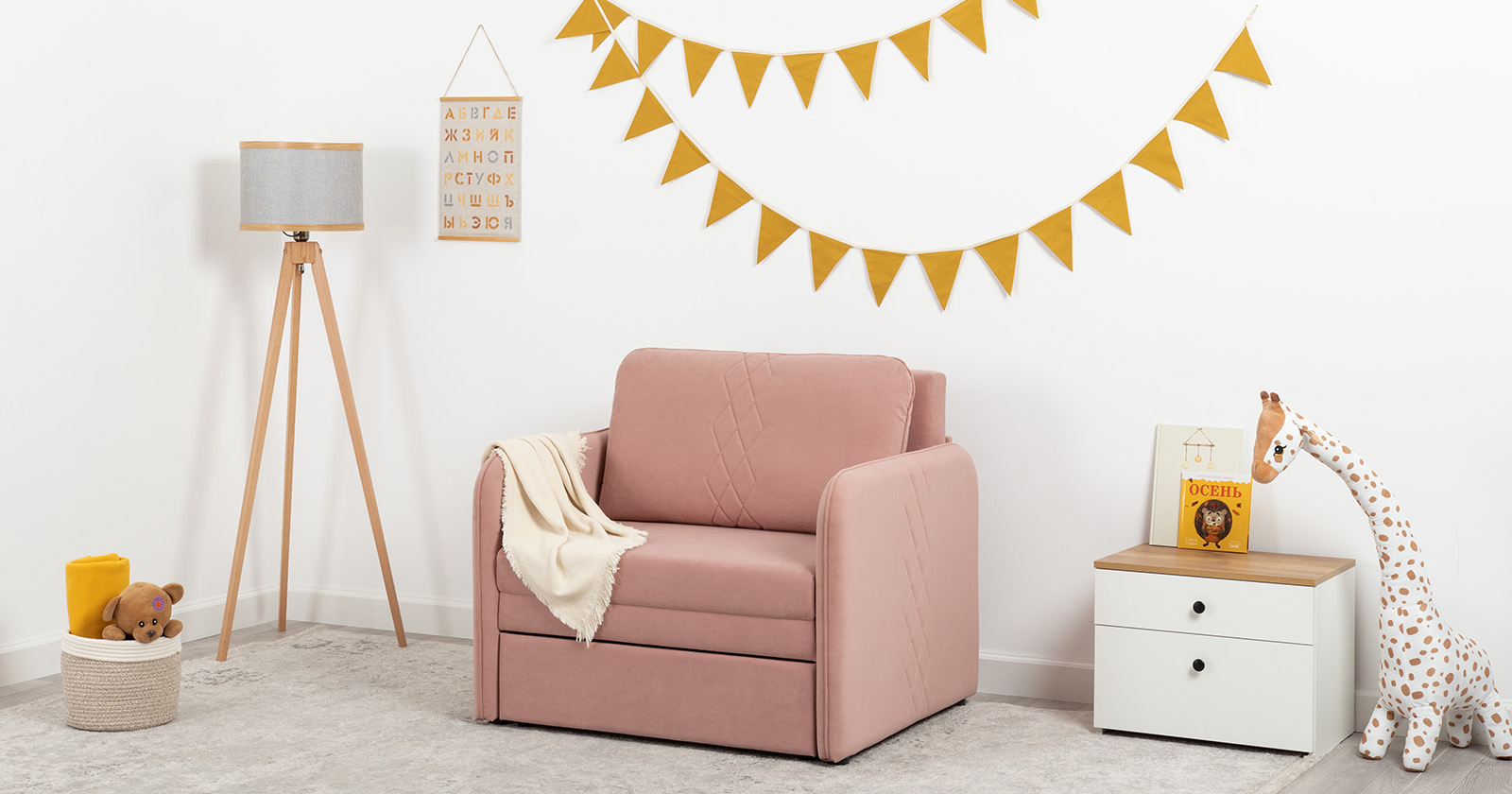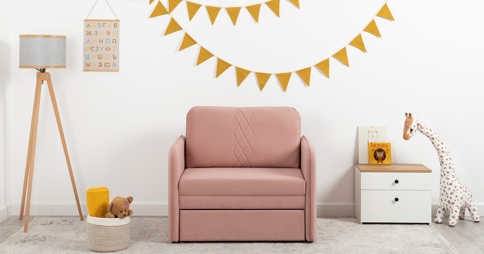 Стильный компактный диван для детской и гостиной. При своих скромных размерах он трансформируется в полноценное спальное место для детей и подростков. Лаконичный дизайн в виде декоративной стежки подчеркивает фактуру велюра, а небольшие размеры позволят разместить его в любом пространстве.