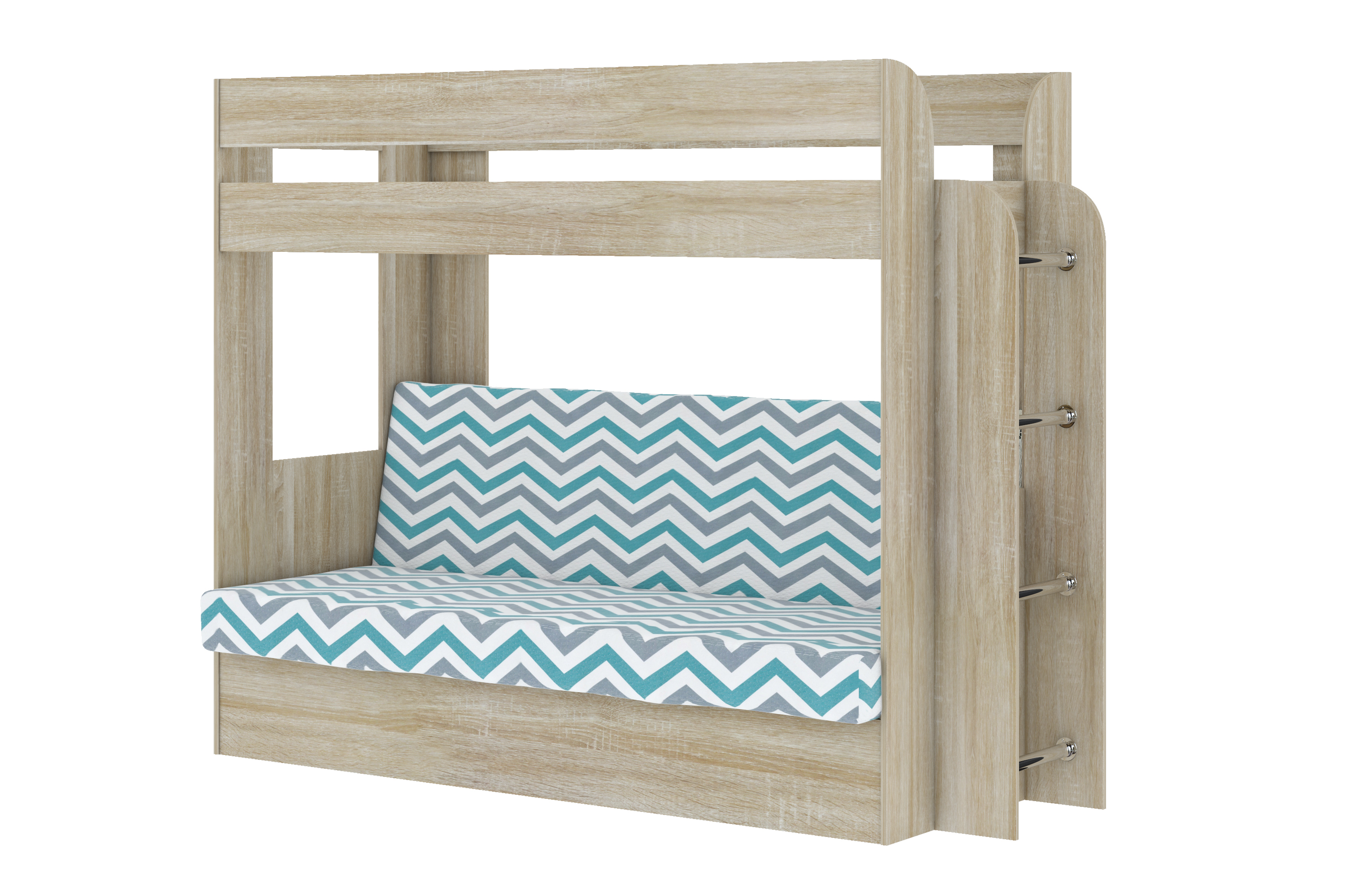 Кровать детская двухъярусная Карамель 75 Дуб Сонома, диван - велюр WILLY MINT бирюзовые зигзаги (сборка на любую сторону) спальное место верх 80х190, низ 120х185