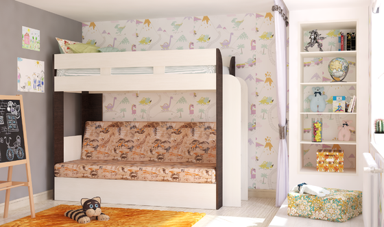 Двухъярусная кровать Акварель сэкономит свободное пространство в комнате, обеспечив спальное место сразу для двоих детей. Модуль оснащен книжной полкой и вместительными бельевыми ящиками, что позволяет использовать их в качестве дополнительного места для хранения вещей. Лестница, которая входит в комплект состоящая их четырех ступеней-ящиков  дает дополнительное место для хранения для игрушек и детских вещей. Ограничитель без острых углов на верхнем ярусе, обеспечит ребенку безопасный сон.