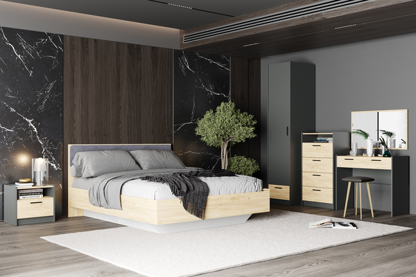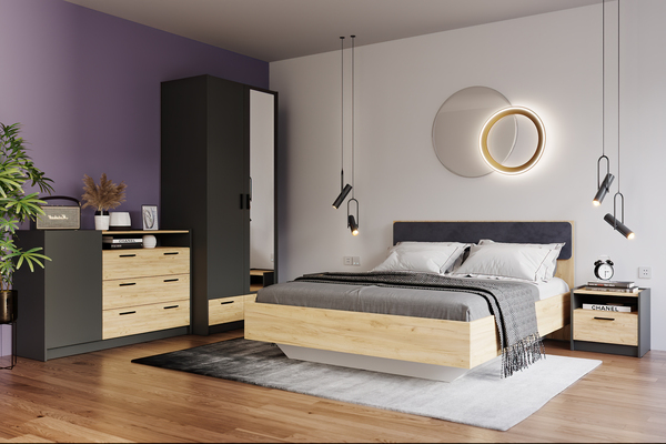 Изголовье кровати имеет элемент с мягкой обивкой, что придает ей элегантность и комфорт. Кровать с оригинальным парящим эффектом не только обеспечивает крепкий сон, но и облегчает уборку в комнате. Кровать оснащена также встроенным ящиком для белья, что позволяет оптимизировать место хранения.