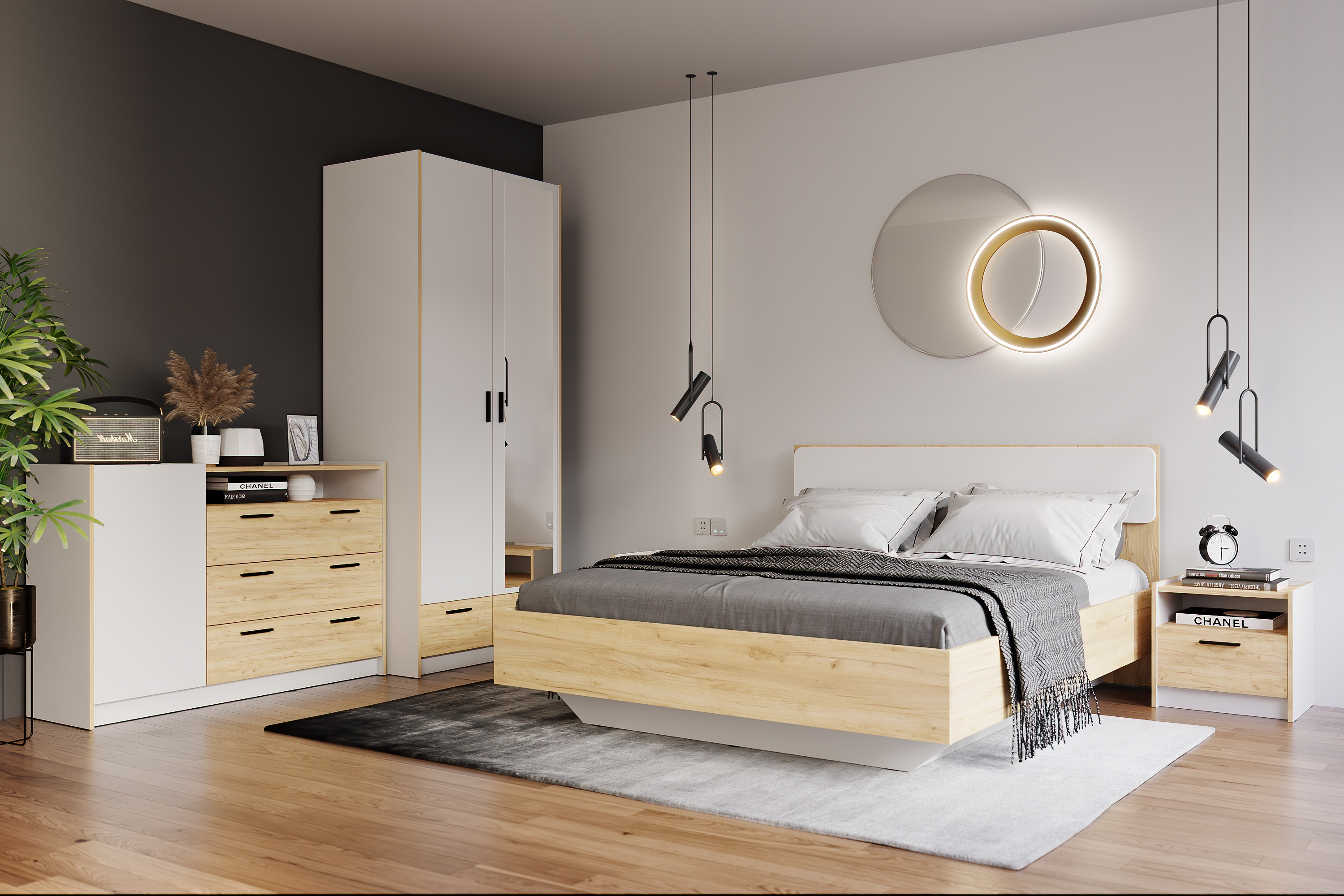 Изголовье кровати имеет элемент с мягкой обивкой, что придает ей элегантность и комфорт. Кровать с оригинальным парящим эффектом не только обеспечивает крепкий сон, но и облегчает уборку в комнате. Кровать оснащена также встроенным ящиком для белья, что позволяет оптимизировать место хранения.