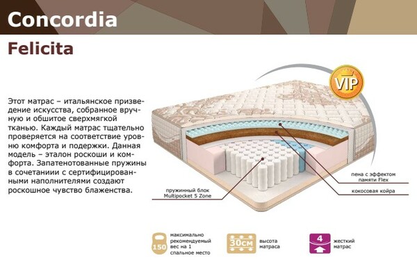 Матрас Felicita - это итальянское произведение искусства, собранное вручную и обшитое сверхмягкой тканью. Каждый матрас тщательно проверяется на соответствие уровню комфорта и поддержки. Данная модель - эталон роскоши и комфорта. Запатентованные пружины в сочетании с сертифицированными наполнителями создают роскошное чувство блаженства. Матрас объединяет в себе все лучшие свойства материалов, специально созданных для достижения максимального комфорта и уюта. Надежная внутренняя конструкция матраса обеспечивает отличную поддержку позвоночника. А высокоэластичная суперпена с эффектом памяти создает непревзойденное ощущение невесомости и легкости. Особенную прохладу, свежесть и мягкость придает матрасу Concordia Celenzio чехол, выполненный из трикотажа с волокнами вискозы и пропитанный ионами серебра. Погружаясь в сказочный волшебный сон, Вы будете чувствовать лишь нежность, легкость и беззаботность.