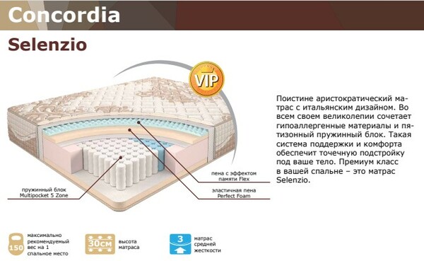 Поистине аристократический матрас с итальянским дизайном. Во всем своем великолепии сочетает гипоаллергенные материалы и пятизонный пружинный блок. Такая система поддержки и комфорта обеспечит точеченую подстройку под ваше тело. Премиум класс в вашей спальне - это матрас Selenzio. Матрас объединяет в себе все лучшие свойства материалов, специально созданных для достижения максимального комфорта и уюта. Надежная внутренняя конструкция матраса обеспечивает отличную поддержку позвоночника. А высокоэластичная суперпена с эффектом памяти создает непревзойденное ощущение невесомости и легкости. Особенную прохладу, свежесть и мягкость придает матрасу Concordia Celenzio чехол, выполненный из трикотажа с волокнами вискозы и пропитанный ионами серебра. Погружаясь в сказочный волшебный сон, Вы будете чувствовать лишь нежность, легкость и беззаботность.