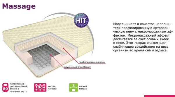 Модель "Massage" высостой 18,5 см имеет в качестве наполнителя высококачественный профилированный пенополиуретан с микромассажным эффектом. Данный эффект достигается за счет особых ячеек в пене. Матрас по периметру имеет систему усиления поролоном плотностью 55 кг/куб.м. Этот матрас окажет расслабляющее воздействие на весь организм во время сна и отдыха.