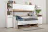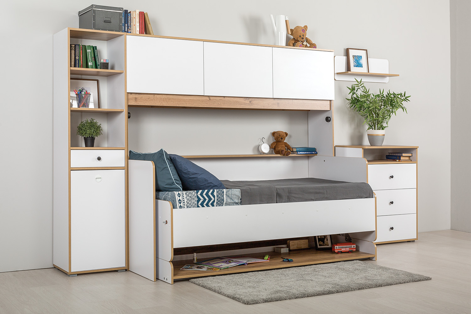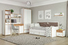 Светлая и аккуратная молодёжная мебель. Основой модульной системы является кровать-трансформер. Её столешница имеет постоянный горизонт, то есть при трансформации не нужно убирать вещи. Система хранения с подъёмными фасадами значительно расширяет функционал.
