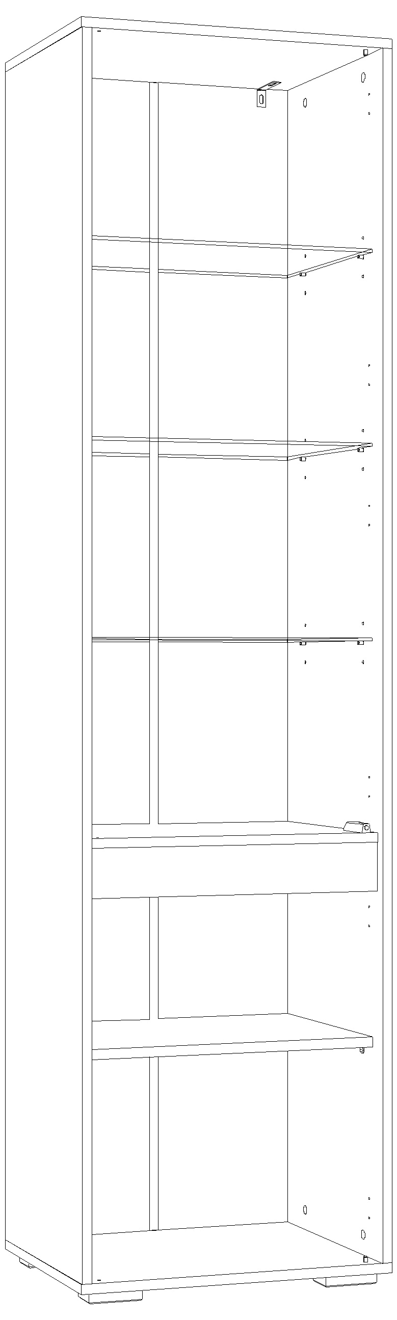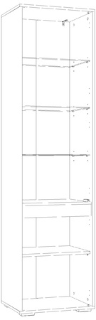 Фурнитура: Шкаф собирается с помощью шкантов, эксцетриковых стяжек и дюбелей быстрого монтажа. Полки из ЛДСП 16 мм на фиксирующих полкодержателях. Полки из стекла 5 мм на полкодержателях с кембриком. Опоры регулируемые №01 "Риальто". Петли вкладные Gelony. Ручка нижнего фасада интегрированная. Механизм открывания Hettich Push to open. Все видимые отверстия закрываются заглушками в цвет корпуса.