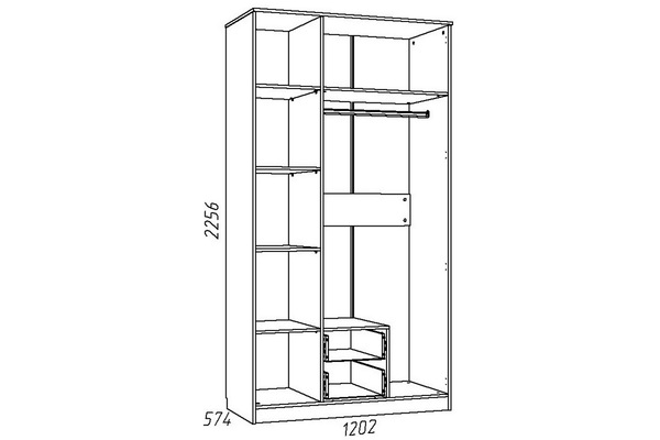 Данный шкаф имеет компактные размеры, но, при этом многофункционален. Внутри модуля предусмотрены овальная штанга для одежды на вешалках, в том числе для размещения длинных вещей. Вместительная часть с пятью полками, позволит рассортировать и разместить большое количество вещей. Два выдвижных ящика внизу идеальны для хранения мелкой одежды. Классические глухие фасады надежно защитят содержимое шкафа от влаги и пыли.
