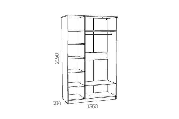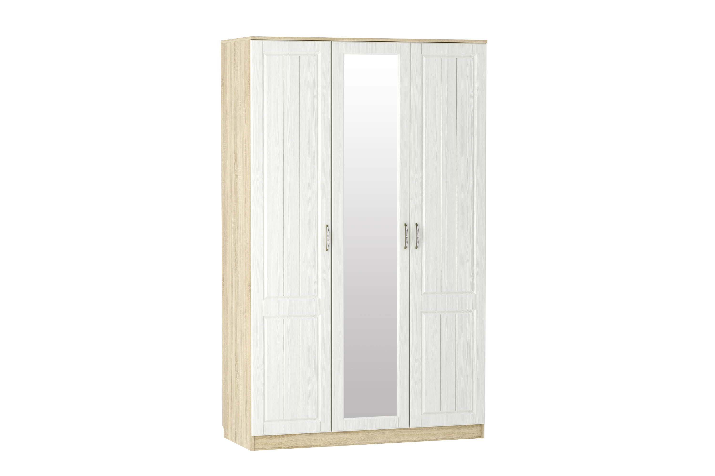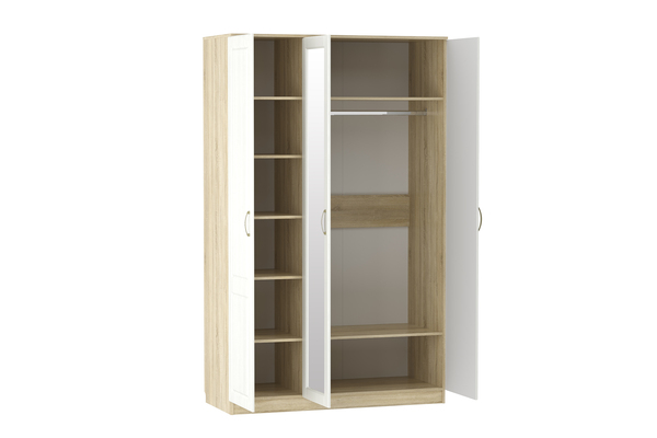 Трехстворчатый шкаф Оливия НМ 040.33 X поможет организовать систематизированное хранение вещей. Вместительная секция со штангой подходит для размещения длинных шуб, пальто и платьев. На широкую верхнюю полку в центральной части модуля можно сложить те вещи, которые нужны не часто. Отделение с пятью полками обеспечит место для хранения трикотажной одежды. Центральная дверца шкафа оборудована зеркалом, в котором можно увидеть себя в полный рост.