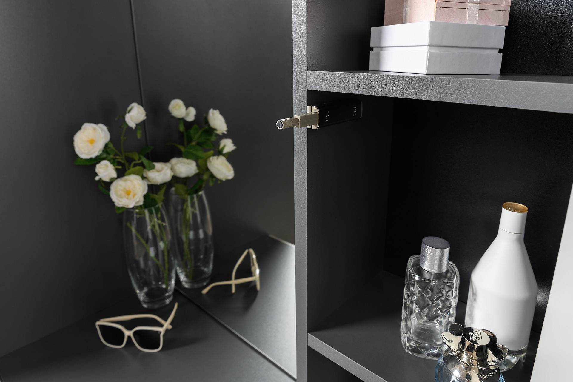 Минималистичные фасады в трендовом цвете без лицевой фурнитуры открываются за край либо нажатием (push-to-open).