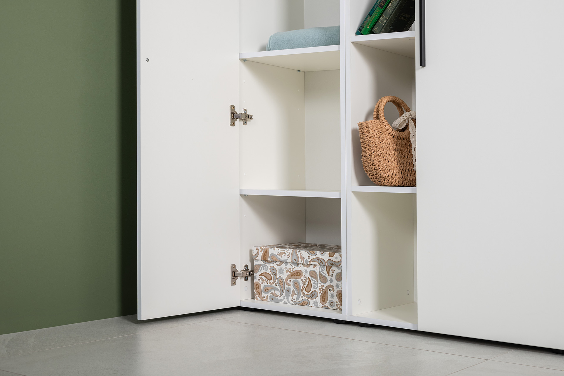 Модули универсальны и сочетаются между собой. Открытые и закрытые ниши для хранения, защитные пластиковые демпферы, съемные полки, направляющие полного выдвижения в ящиках – комфорт продуман до мелочей.