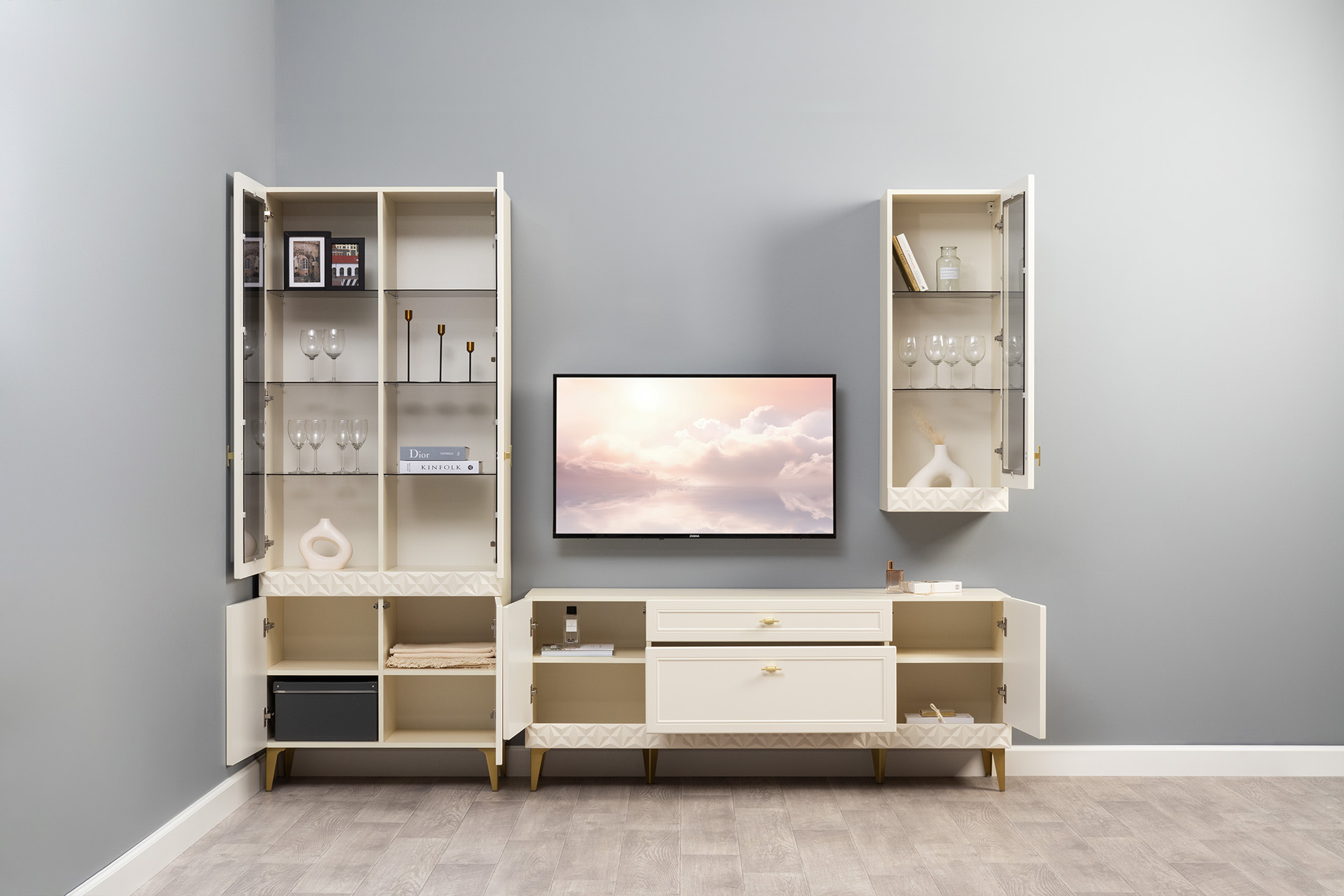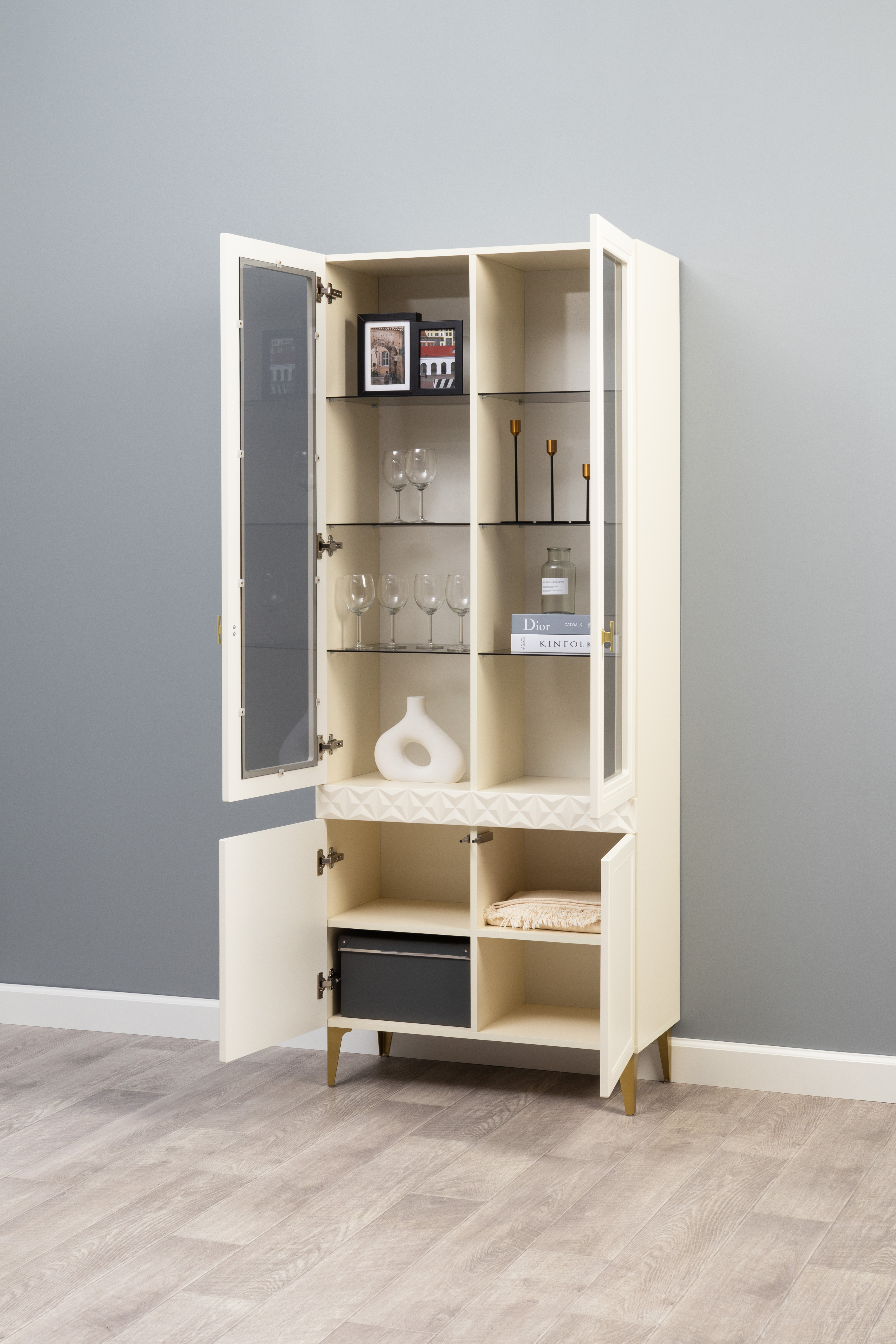 В коллекции представлены три типа витрин с тонированным закалённым стеклом, которые придают пространству лёгкость и свет. «Марион» — идеальное сочетание традиций и актуального дизайна в каждой детали.