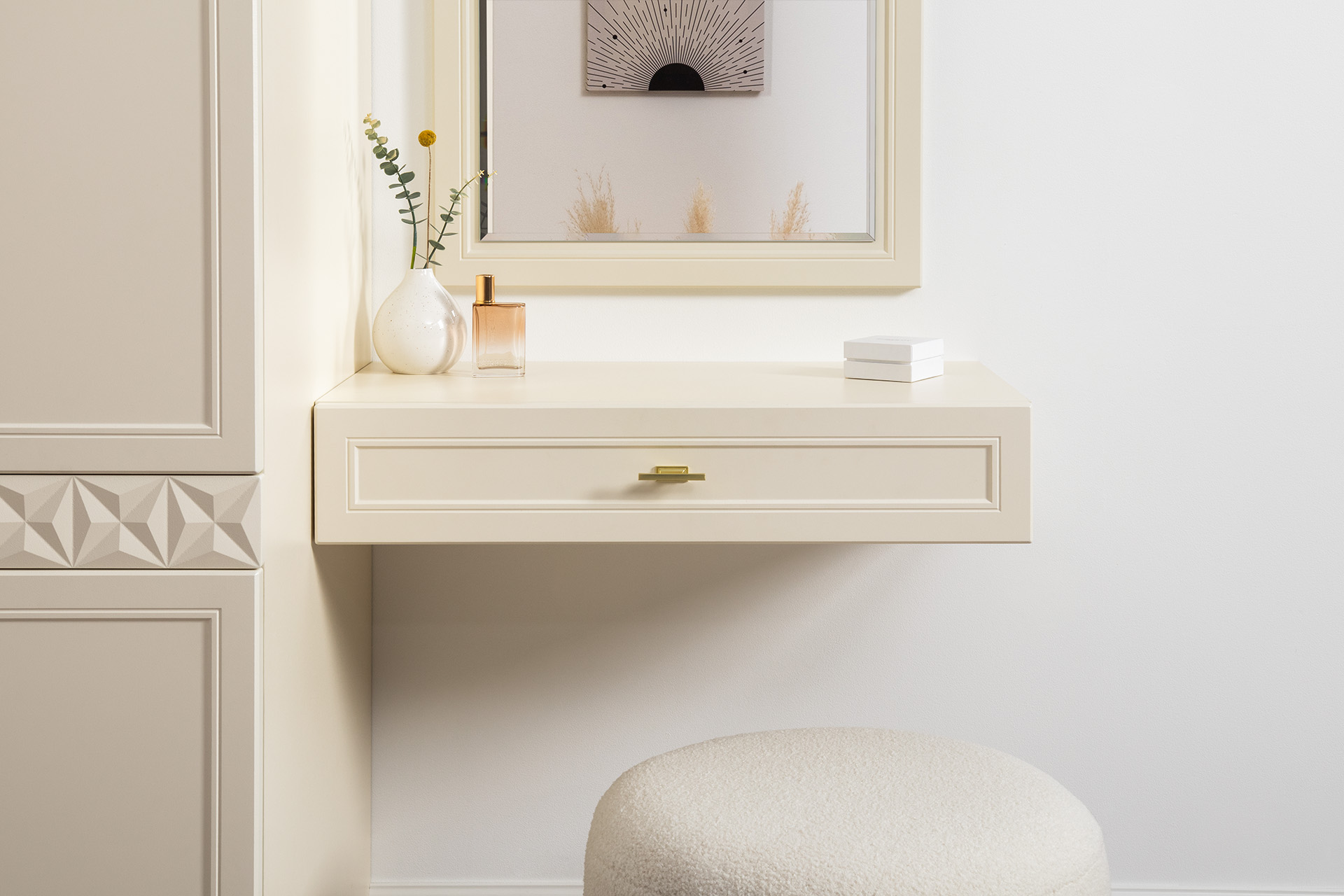Изящные линии, глубокая фрезеровка фасадов из МДФ и благородные оттенки. Утончённая «Слоновая кость» и изысканная «Олива Шагрень» с глубоким зелёным тоном — создают атмосферу уюта, тепла и благородства. Металлические ручки и опоры золотого цвета придают мебели утончённый блеск, а петли и направляющие с доводчиками обеспечивают плавное и бесшумное закрытие фасадов.