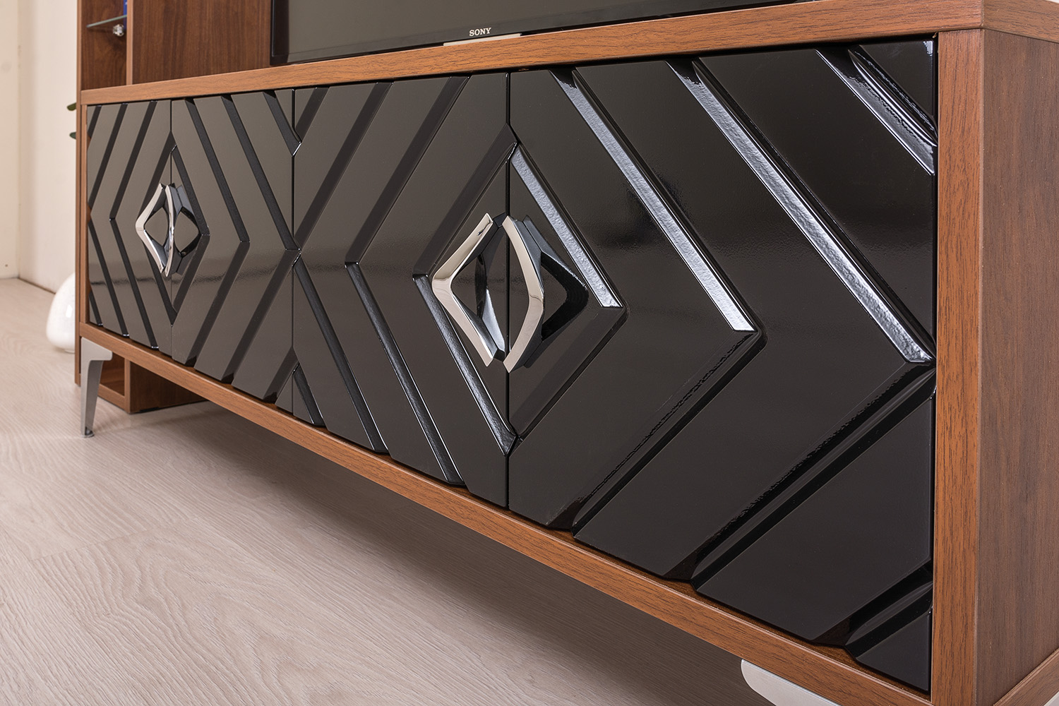 Тумба под ТВ в гостиную Муар 13.261 орех селект каминный, черный глянец ПВХ
