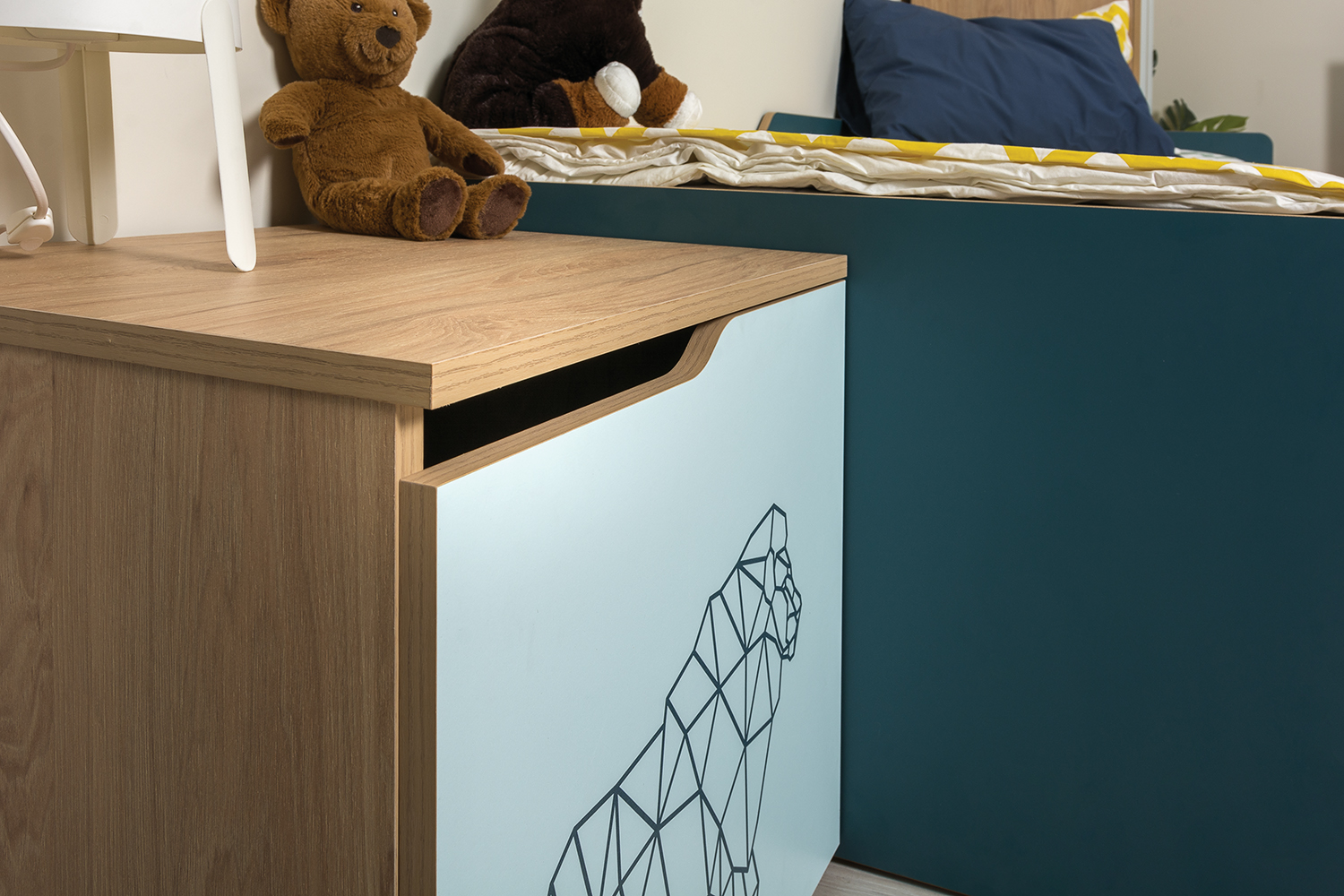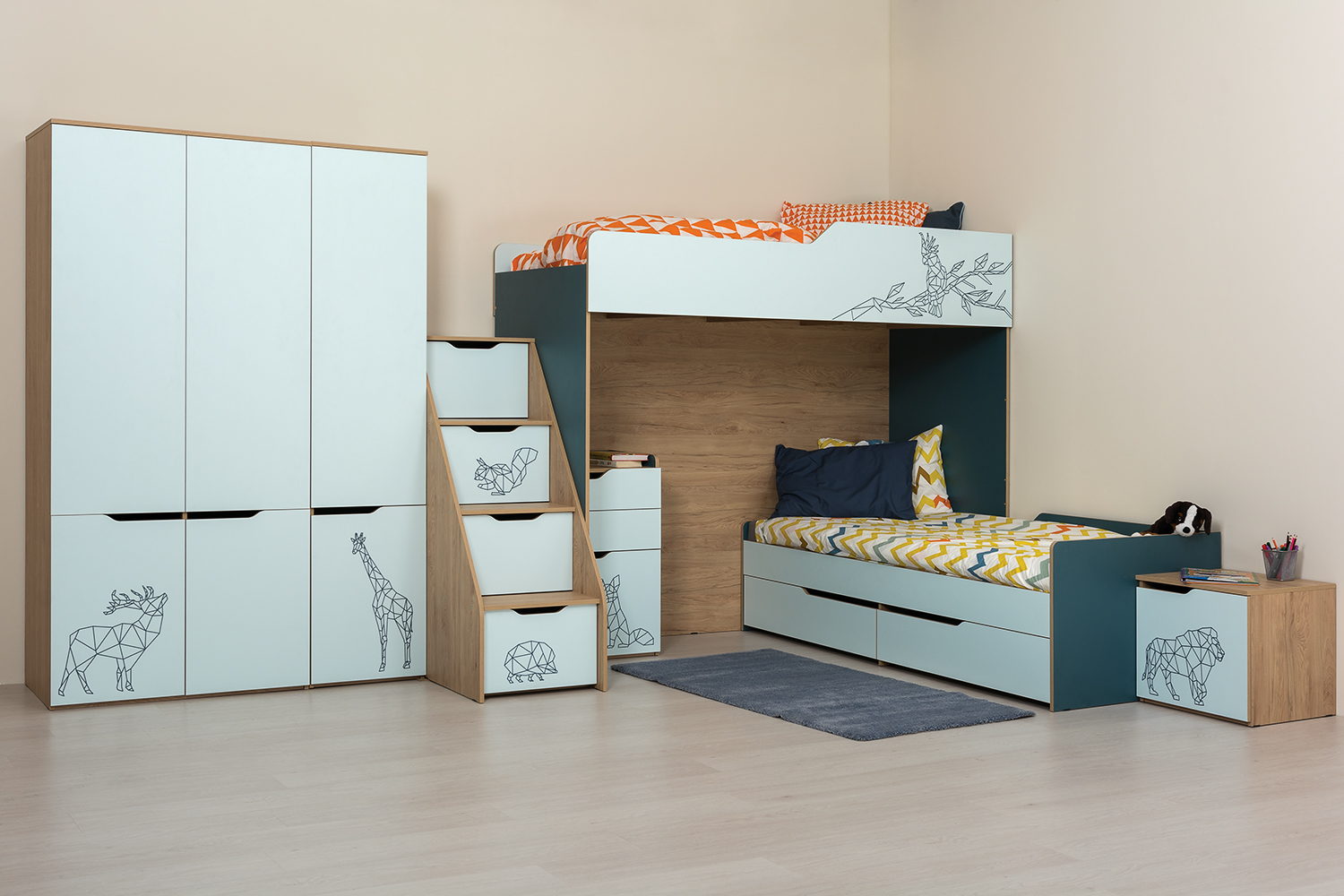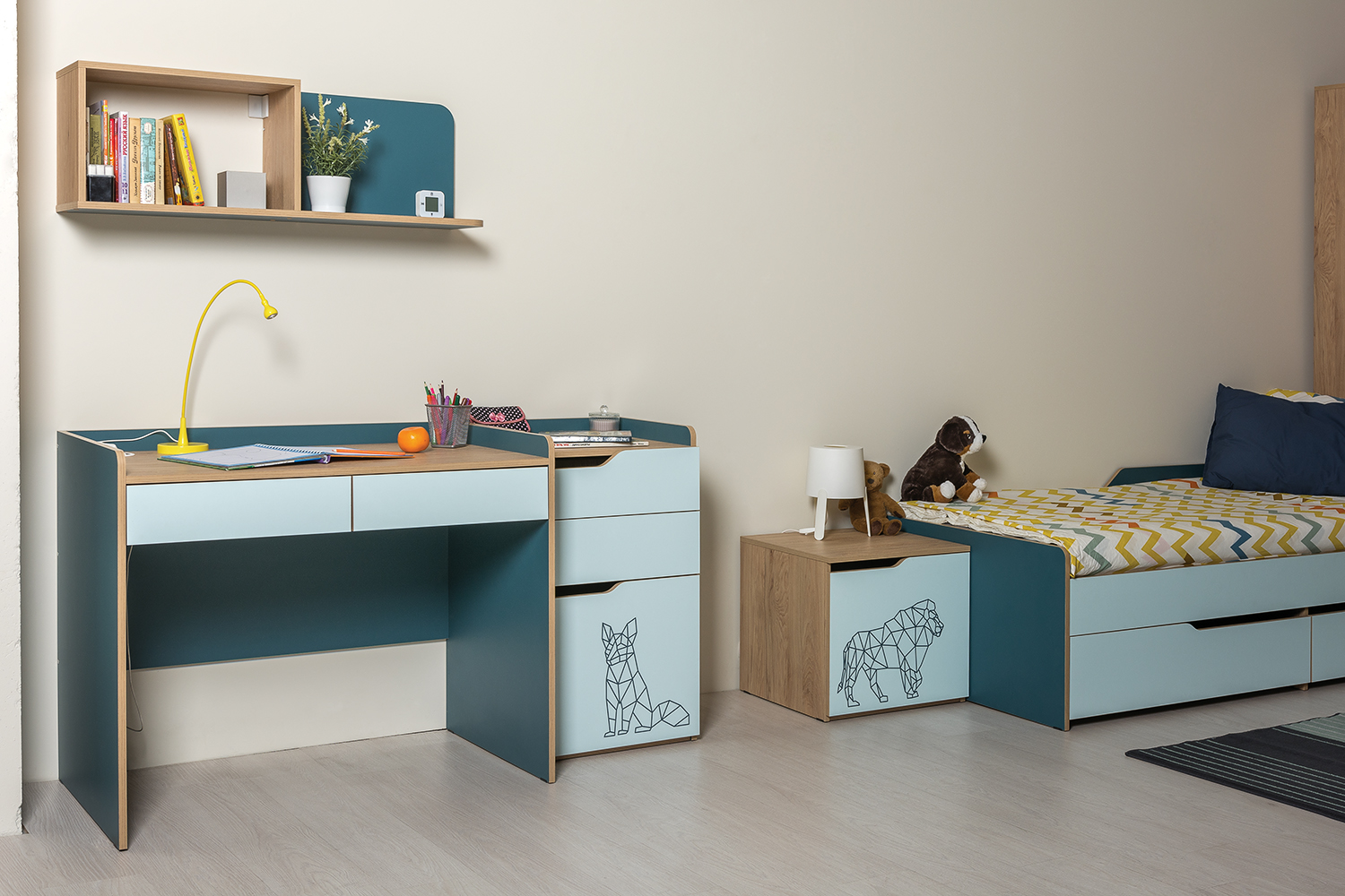 Сочетание свежего мятного цвета и тёмной бирюзы особенно подходит к детскому интерьеру, и является универсальным решением как для мальчика, так и для девочки.