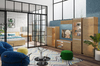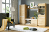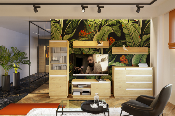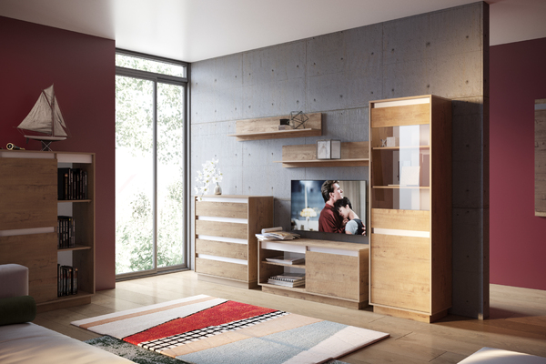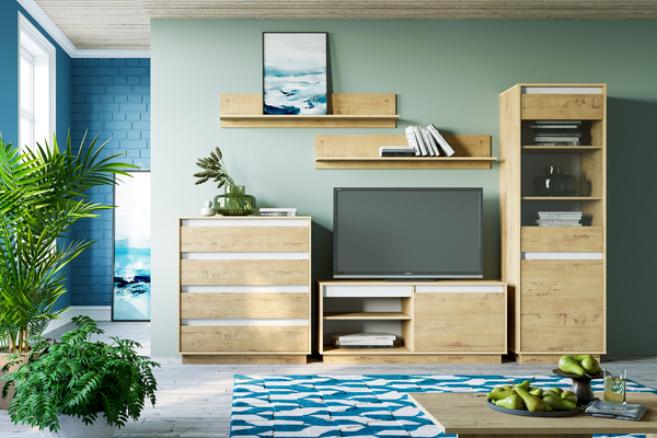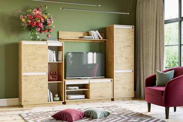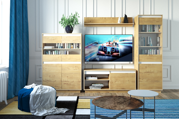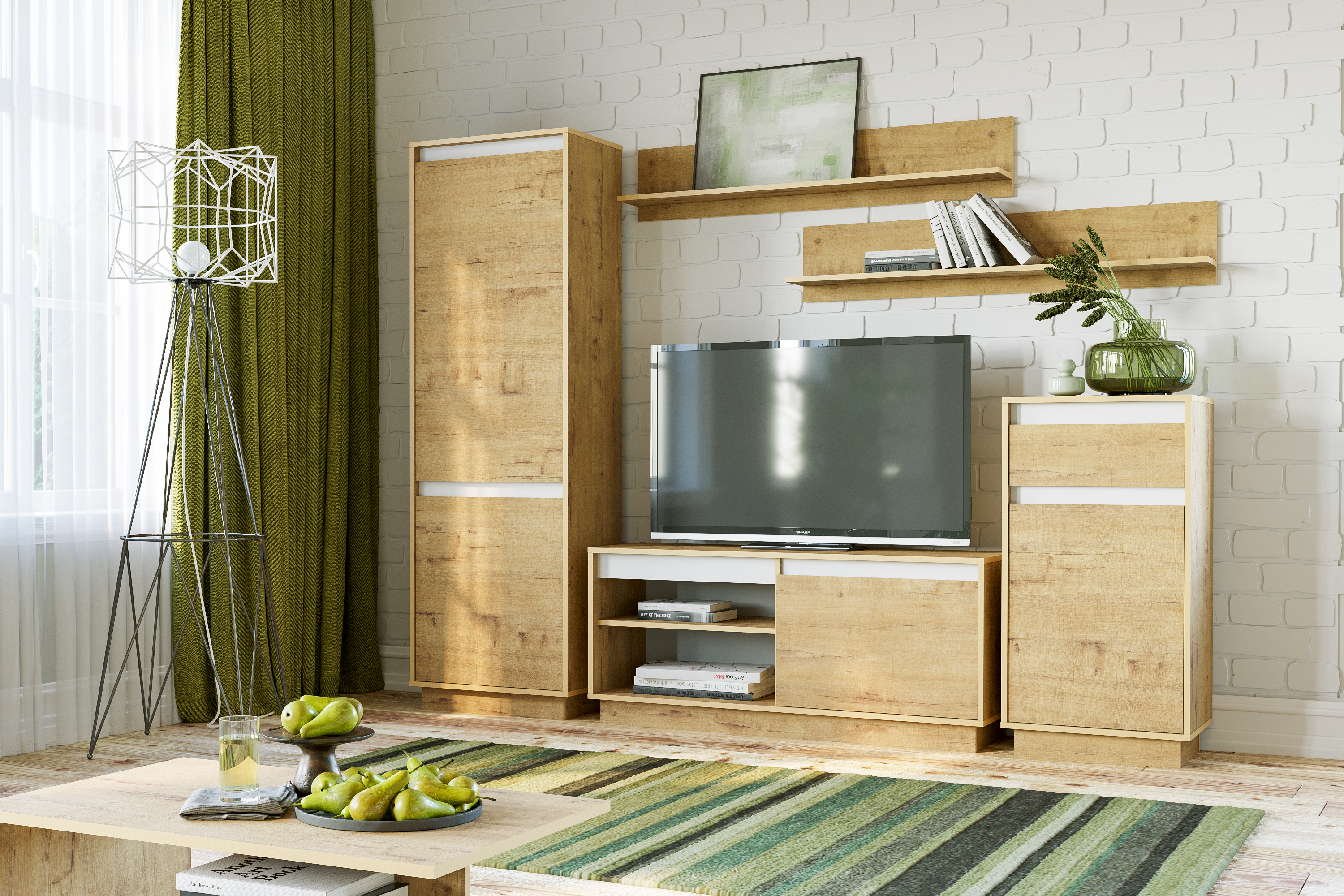 В дизайне тумбы VIRGINIA НМ 011.28 трендовая комбинация древесной текстуры и декора в виде белых монохромных планок. Модуль может быть частью набора или выступать в качестве самостоятельного элемента гостиной. Открытая секция в левой части тумбы оборудована полкой для установки цифровой техники. Правая половина модуля оснащена откидной дверью, которая защищает внутреннее содержимое от влаги и пыли. Данная часть тумбы вместительна и подойдет для размещения в ней книг и документов.