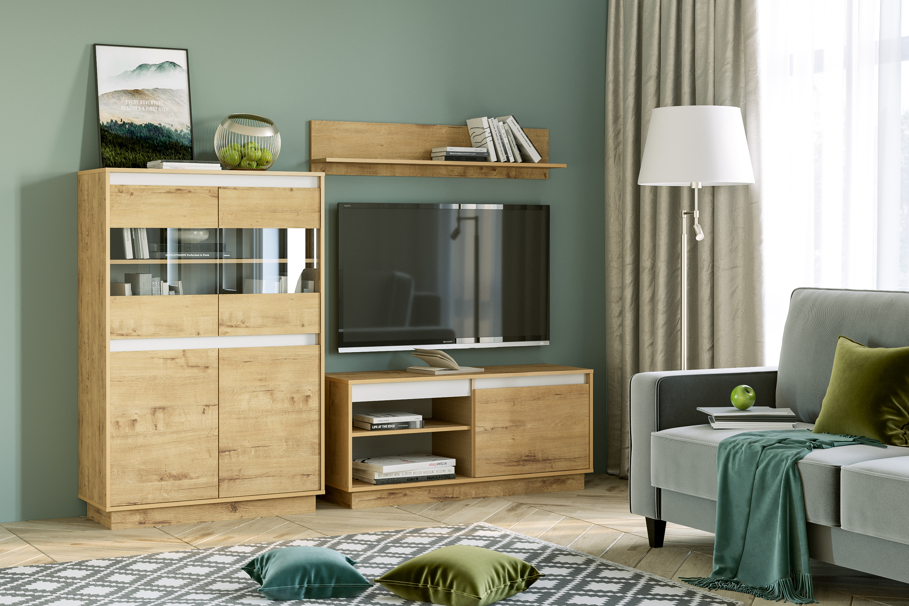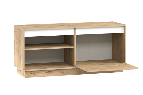 Тумба под ТВ в гостиную Альба дуб золотой CRAFT, белый премиум, без подсветки
